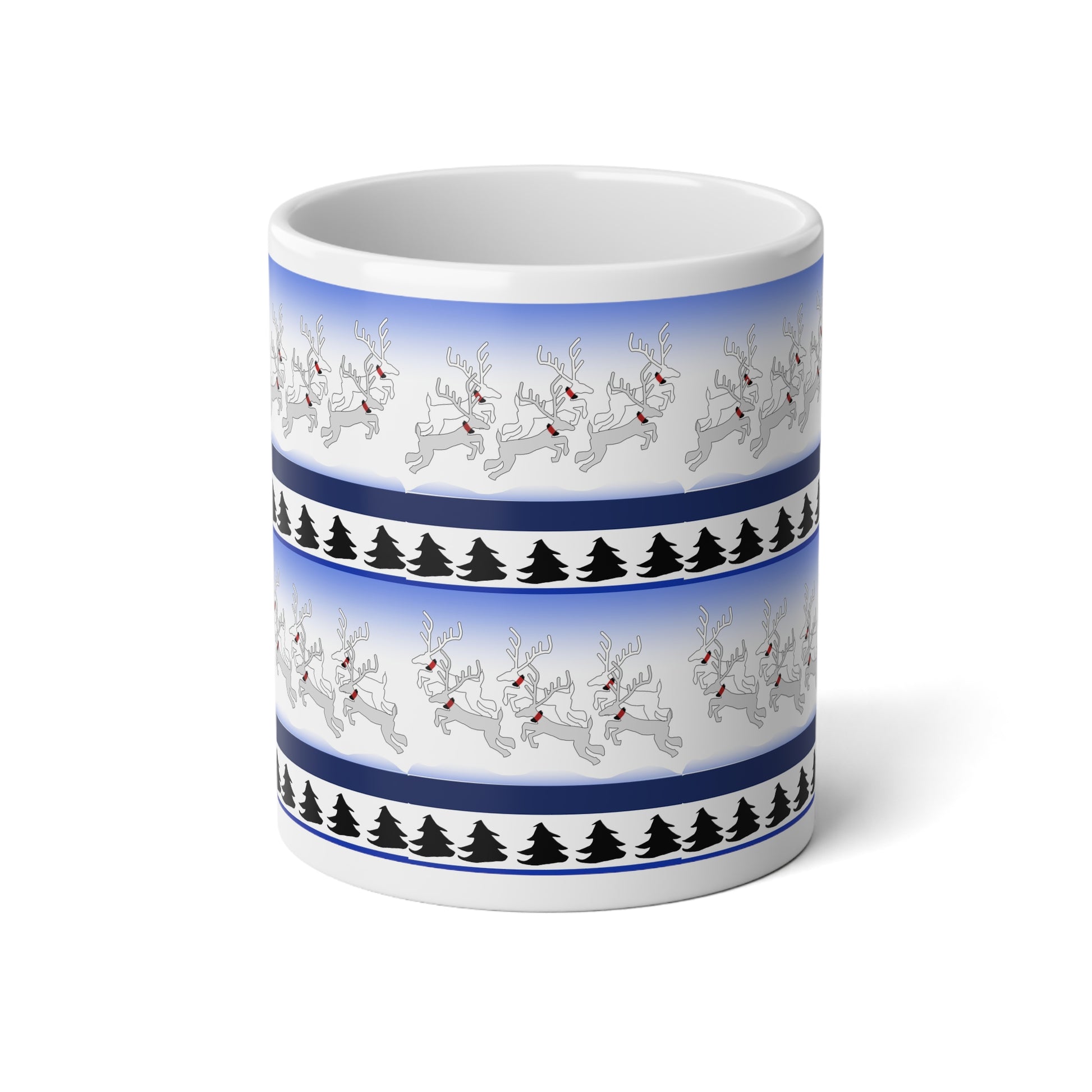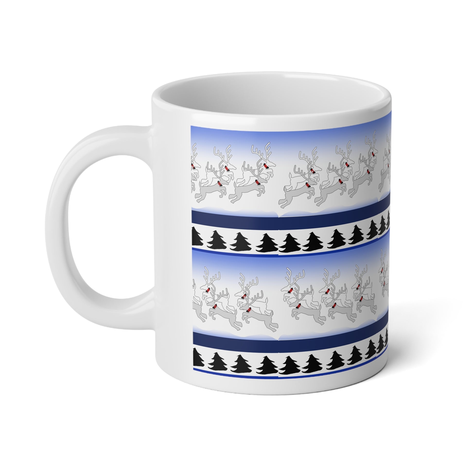 Wake up to a little winter whimsy every morning. This 20oz jumbo mug wraps a frosty gradient and playful reindeer border around your favorite hot drink, balanced by a row of stylized pine silhouettes. It feels like a brisk walk through a snowy lane — bright, clean, and gently festive without shouting holiday slogans. The generous C-handle and roomy capacity let you hold on to warmth for longer, while the glossy ceramic finish makes the artwork pop on chilly mornings or slow, cozy evenings at home.
