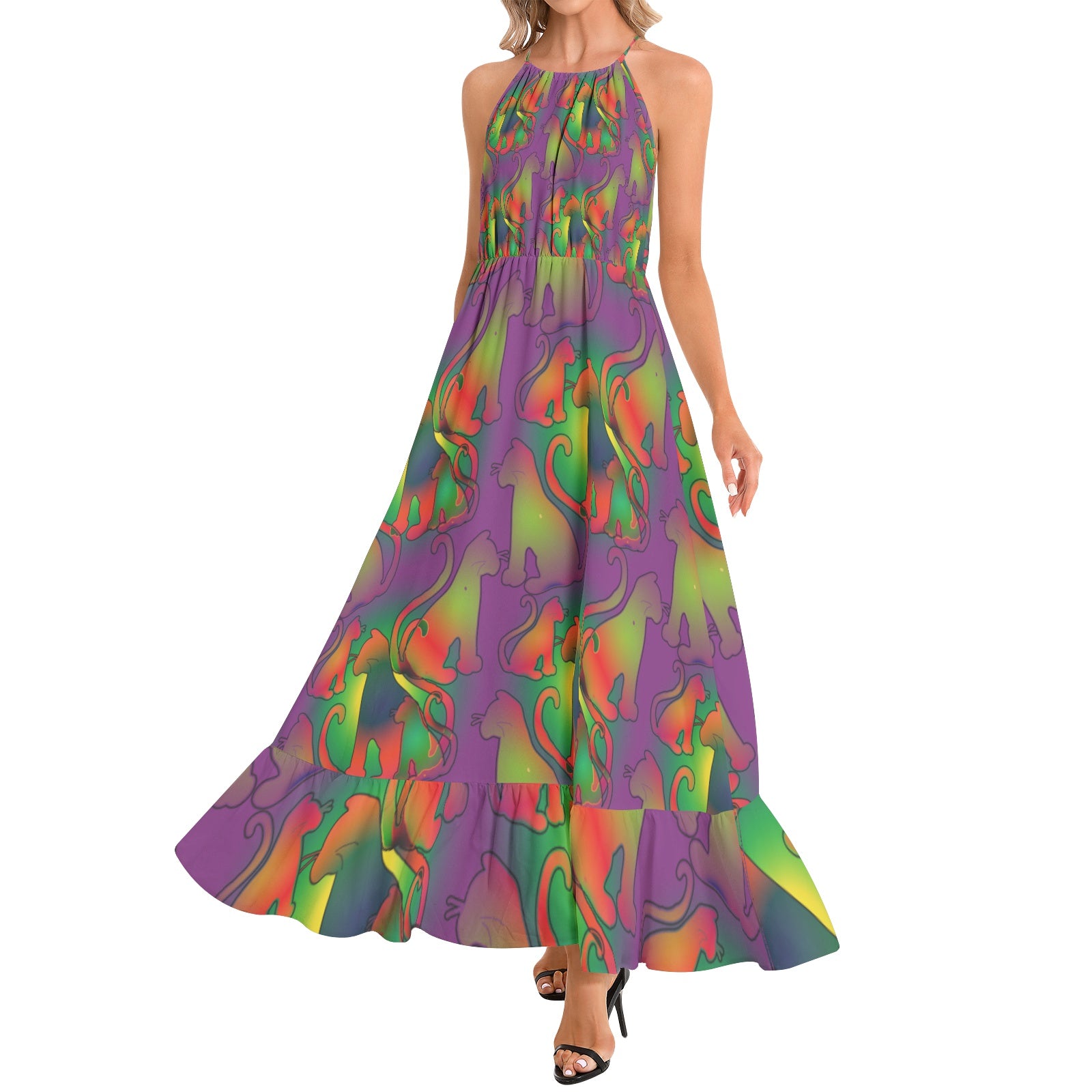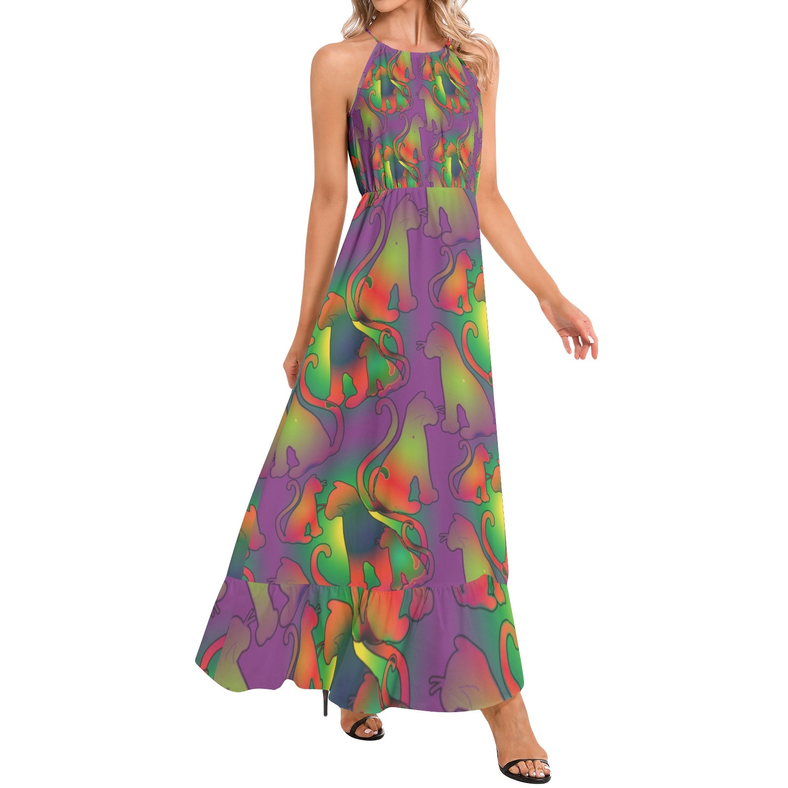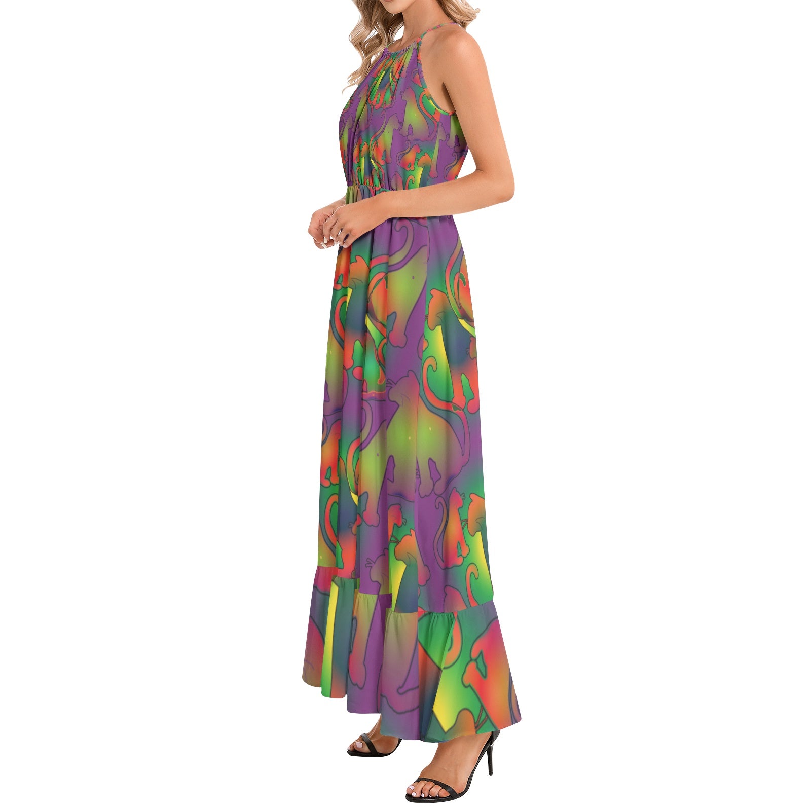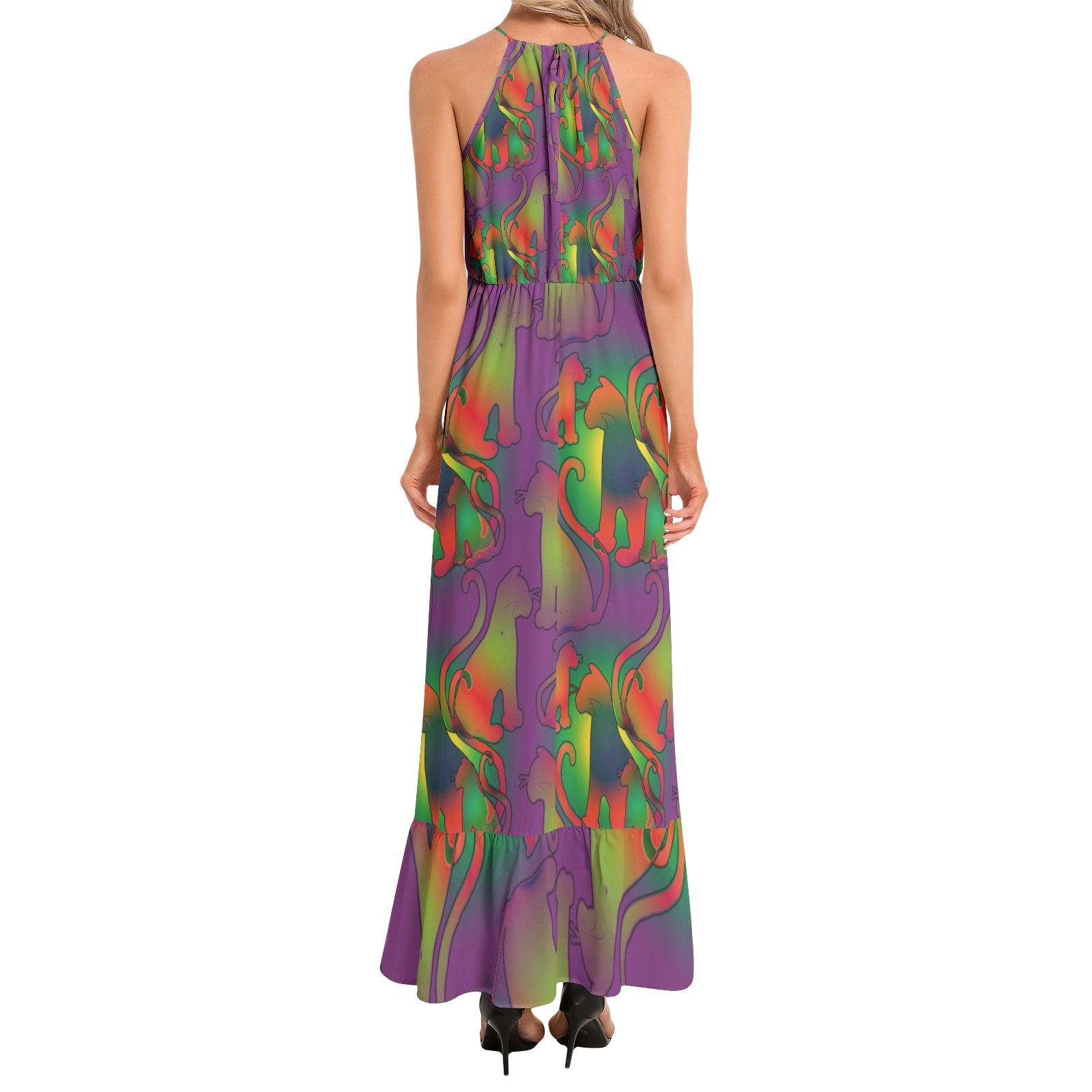 Abstract Cats Ruffle Hem Halter Neck Maxi Dress