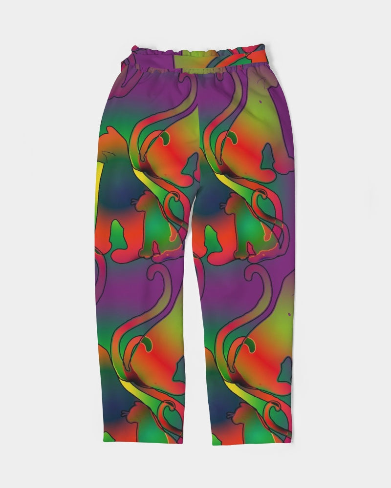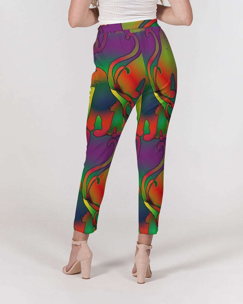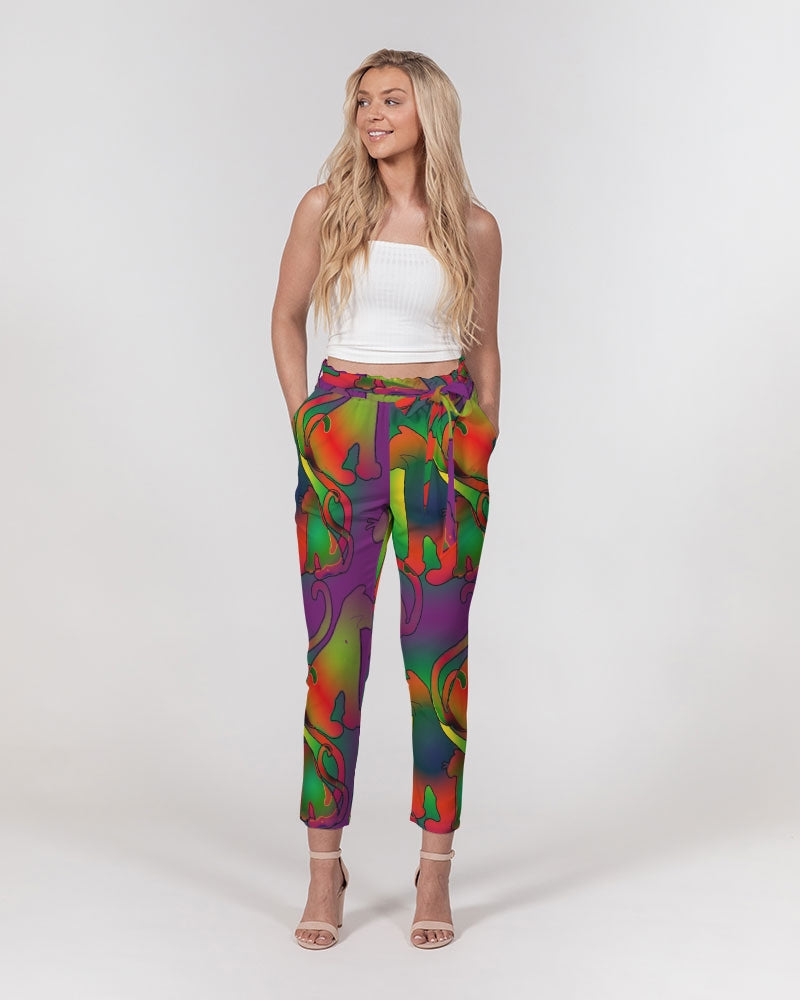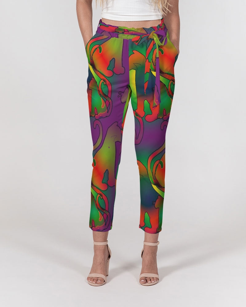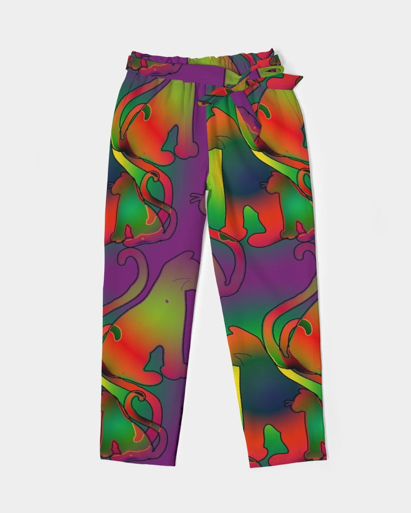 Abstract Rainbow Cats Pattern Women's Belted Tapered Pants