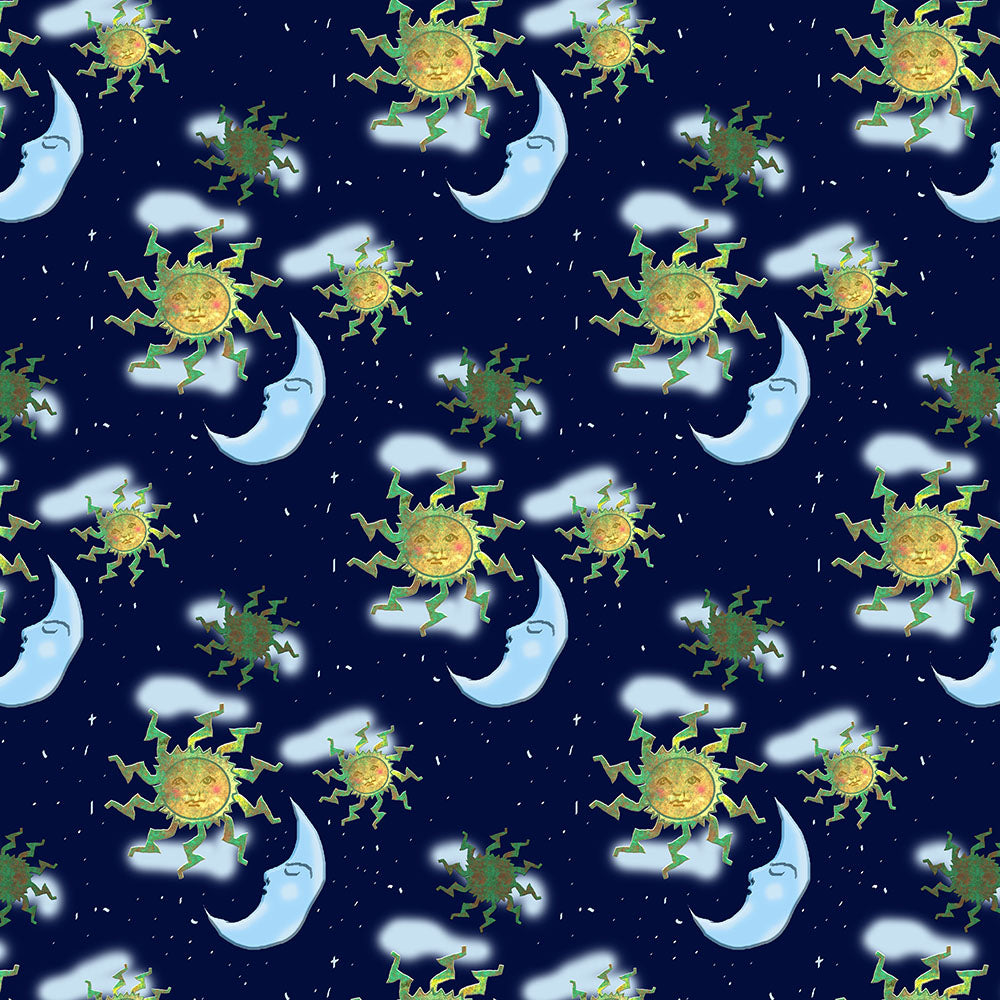 Antiqued graphic of sun and moon with face on starry night background in repeated pattern.