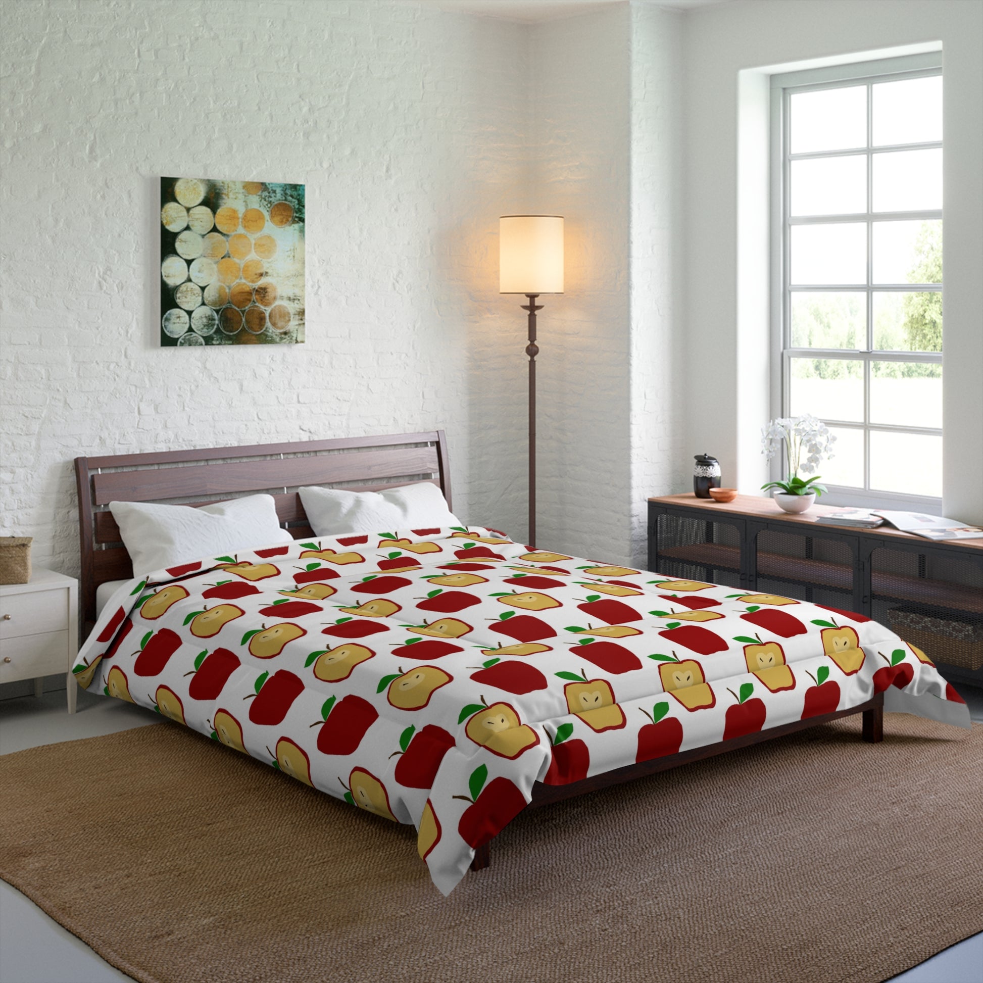 Wrap your room in a playful, cozy vibe with this lightweight comforter featuring a cheery apple pattern. The bright red and pale yellow apples repeat across a crisp white field, bringing a touch of vintage kitchen charm and a wink of nostalgia to bedrooms, reading nooks, or cottage-style guest rooms. Soft microfiber polyester drapes easily over the bed and the subtle double-square quilting keeps the thin, breathable batting in place without weighing the design down. It’s a simple way to brighten early mornings, slow weekend breakfasts in bed, or seasonal refreshes when you want a splash of color without fuss.
