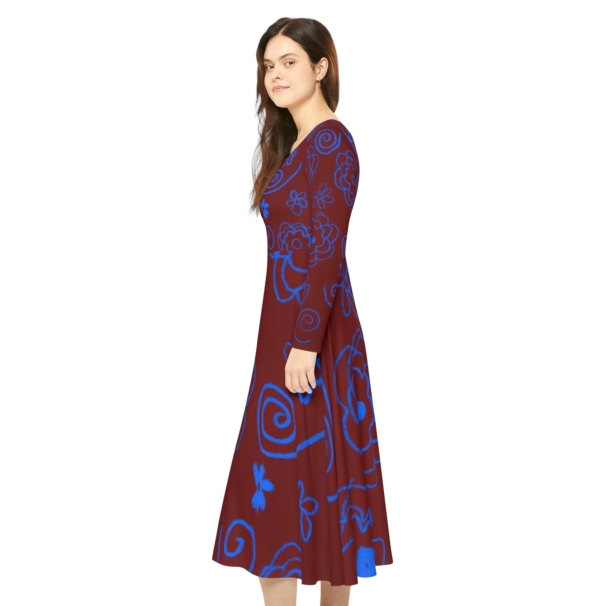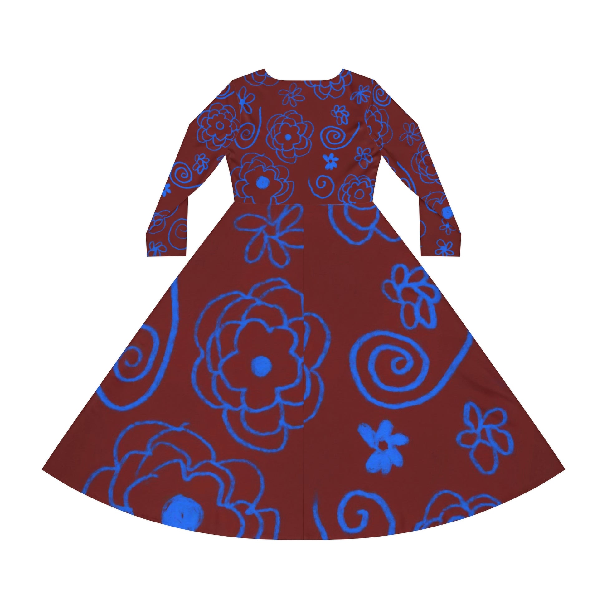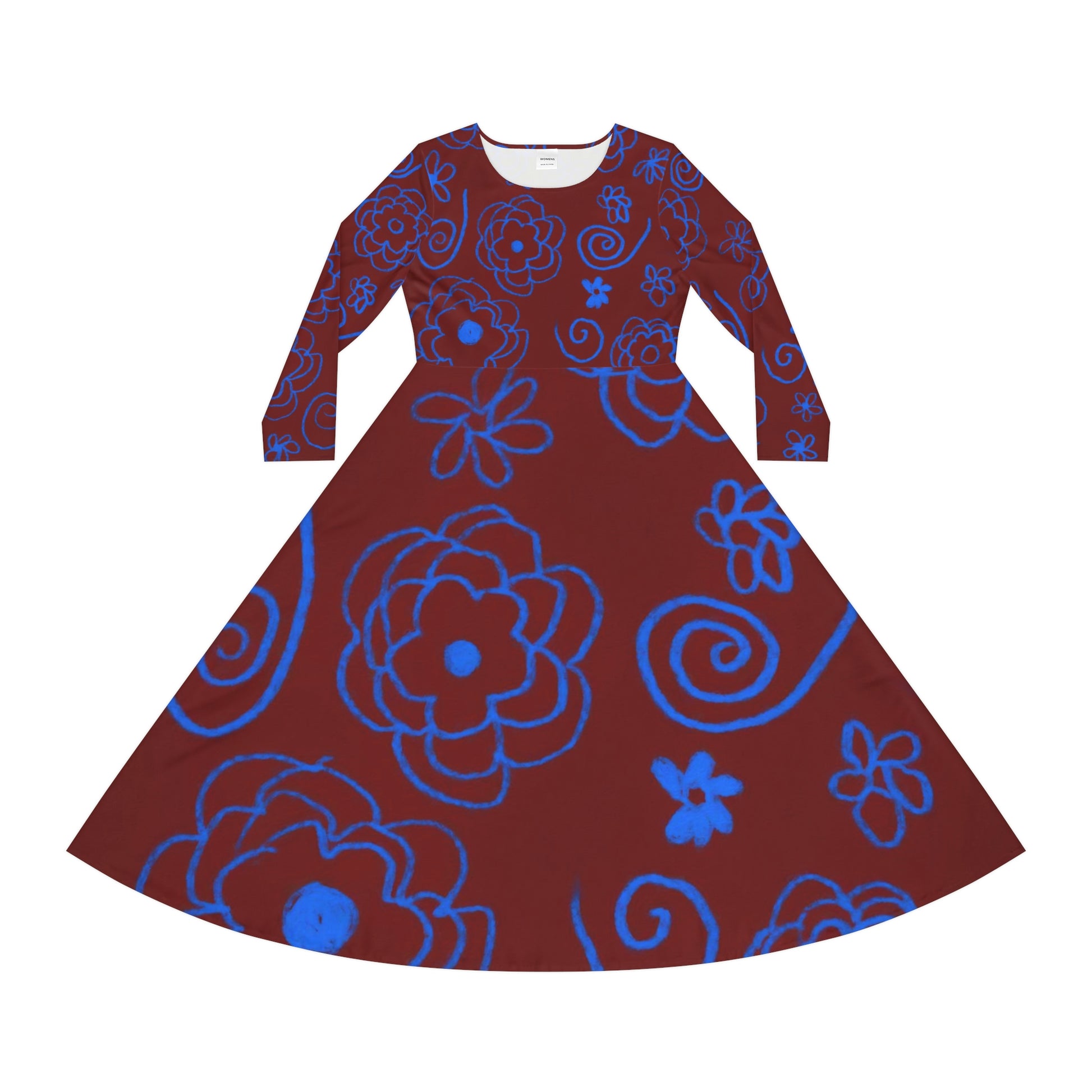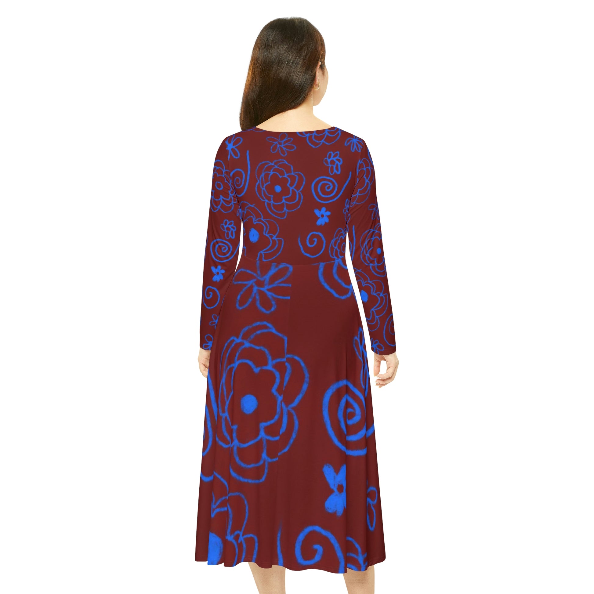 Blue Flower Drawing Women's Long Sleeve Dance Dress
