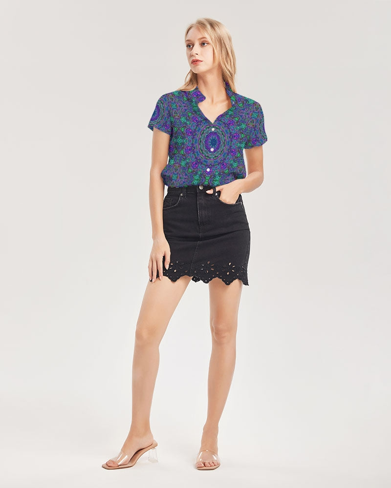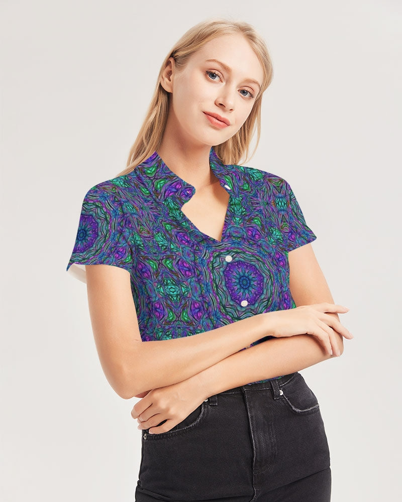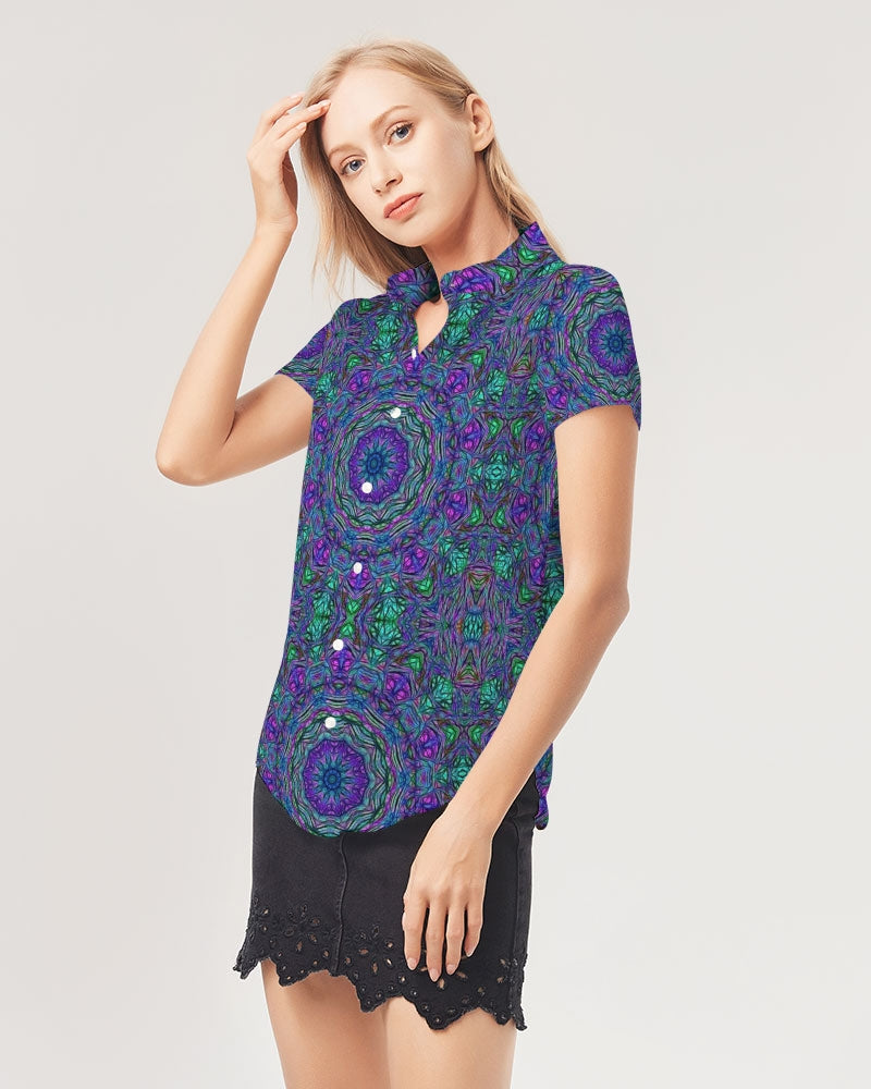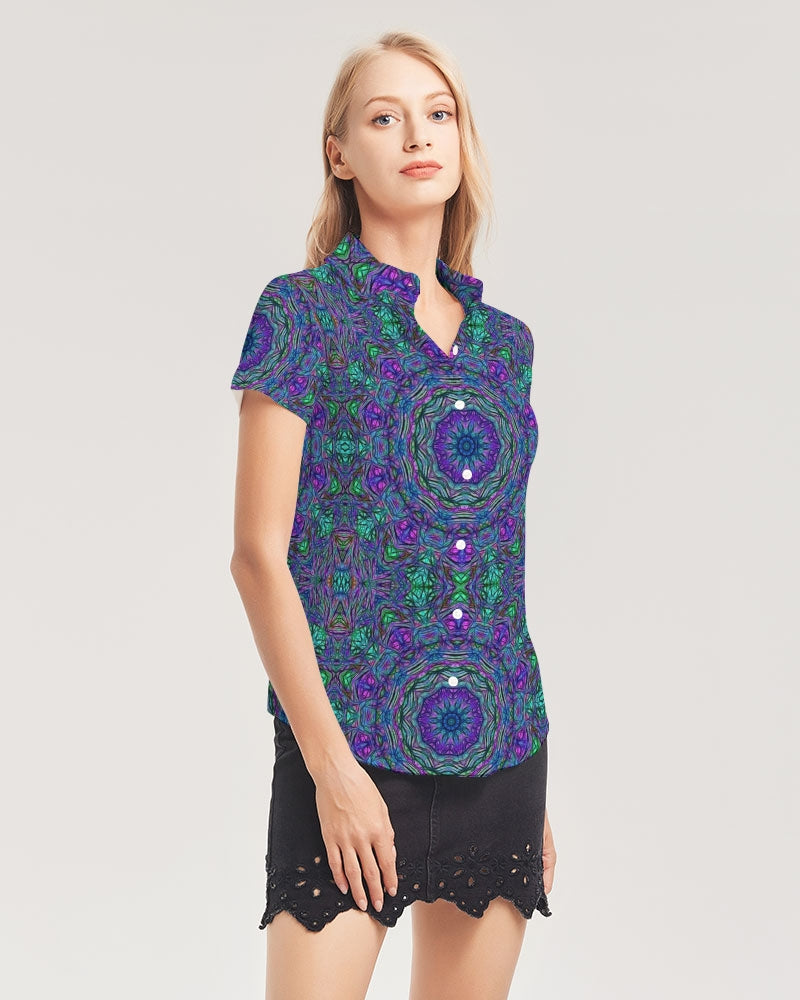 Blue Green Purple Kaleidoscope Women's Short Sleeve Button Up
