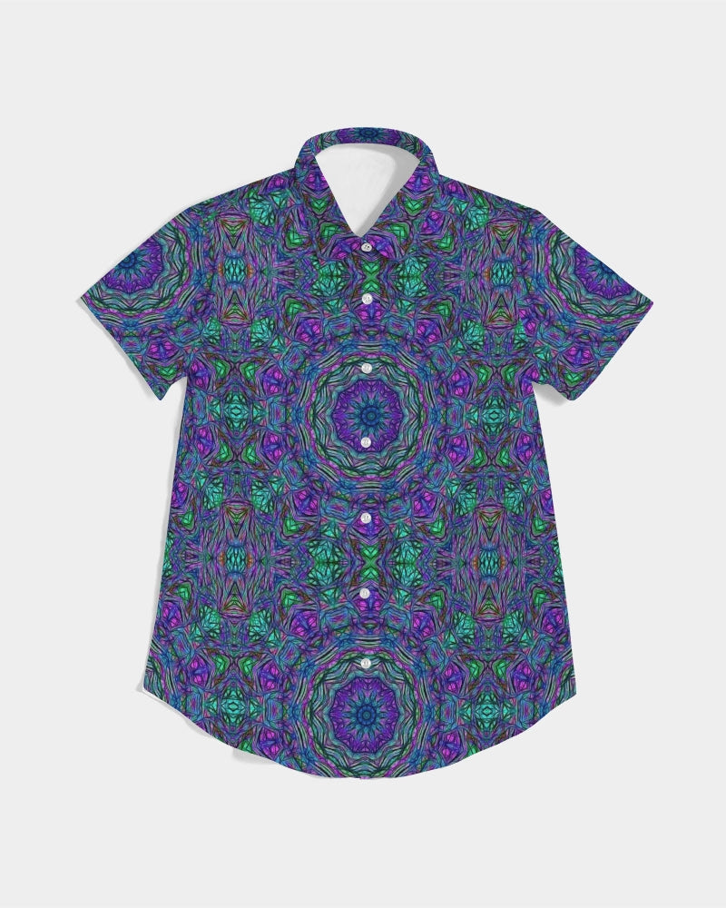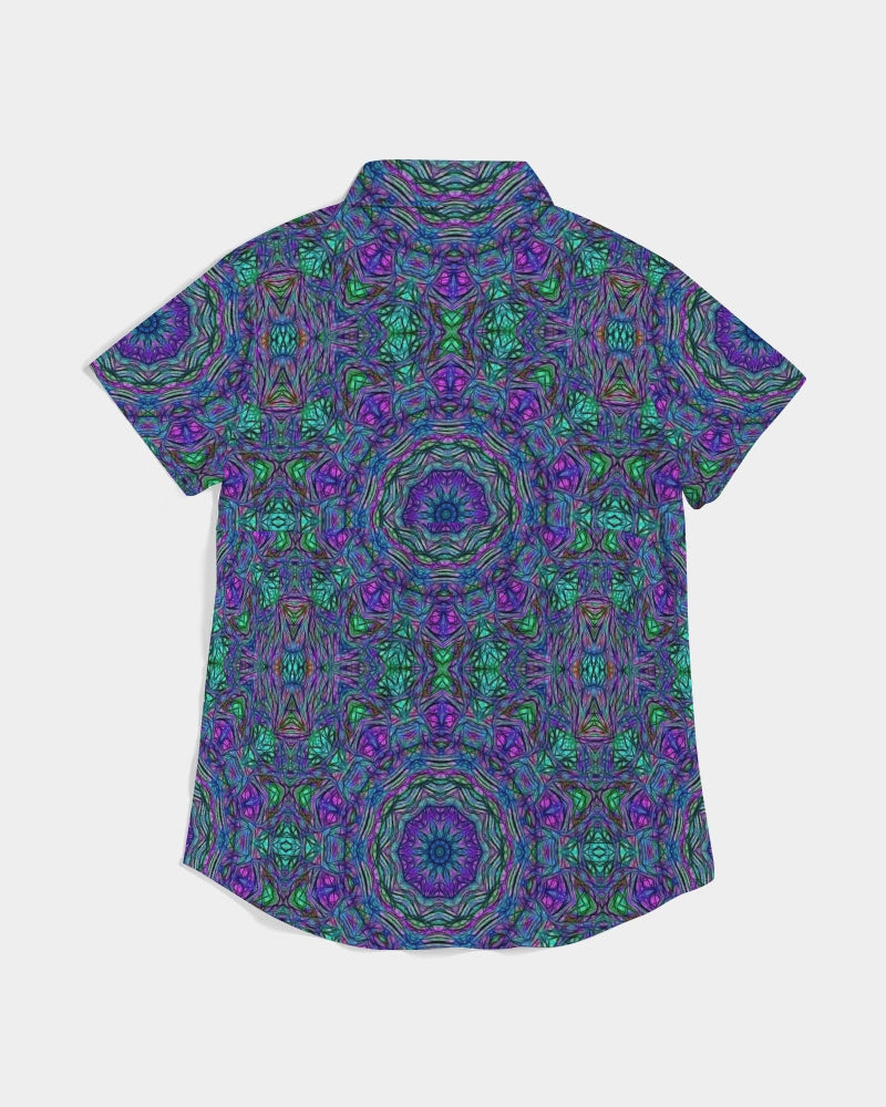 About The ArtBlue Green Purple Kaleidoscope Blue green purple kaleidoscope pattern. Product DetailsKeep it cute and classic in our Short Sleeve Button-Up Top, featuring lightweight woven fabric, a relaxed bodice, white buttons, and a curved hem. Pair with jeans and a blazer for a casual-chic workday look!