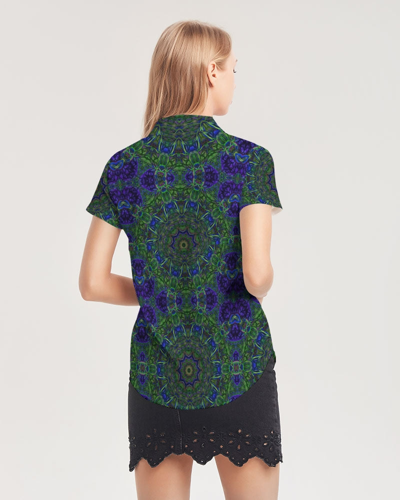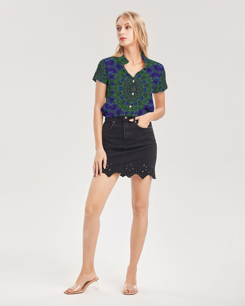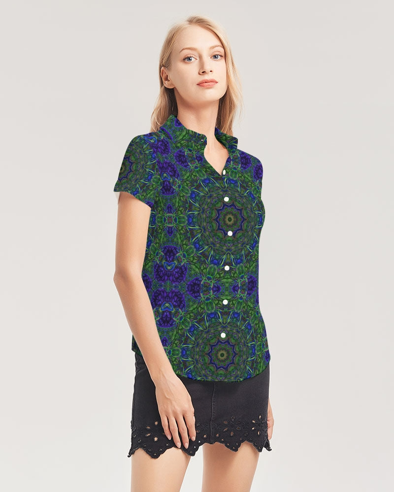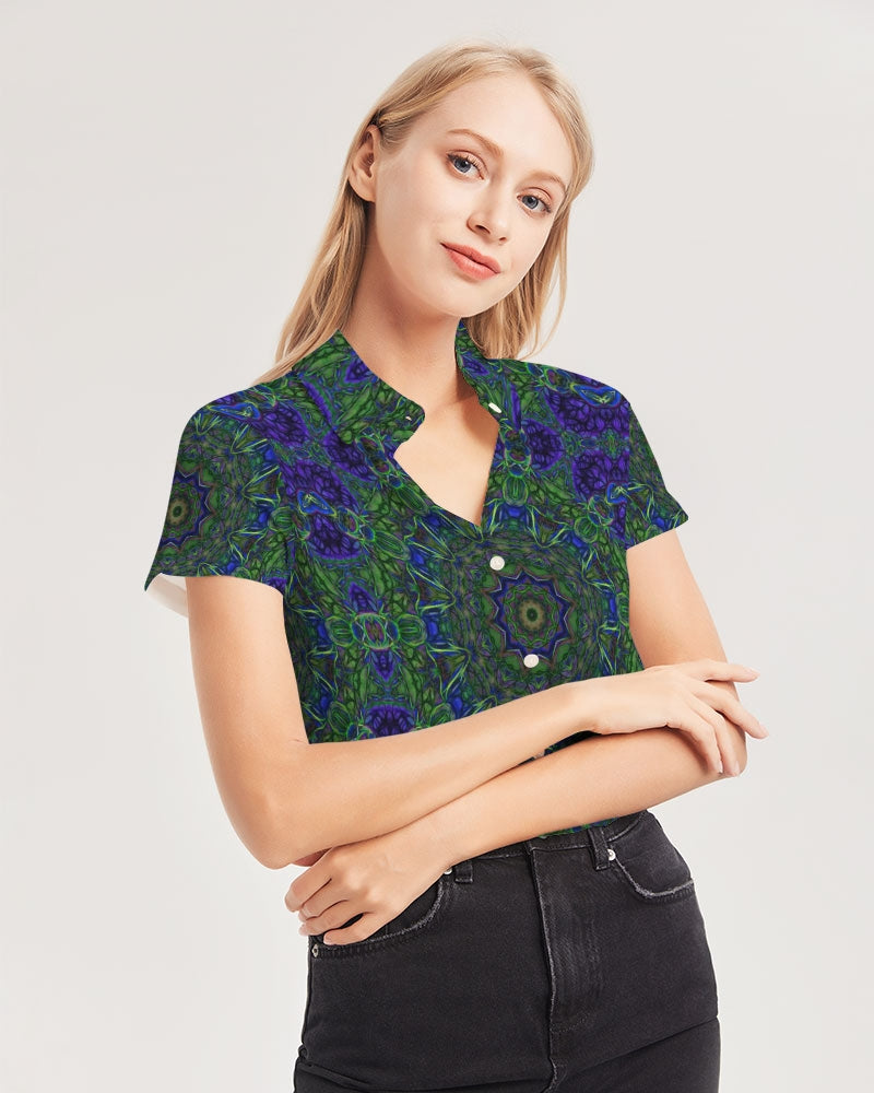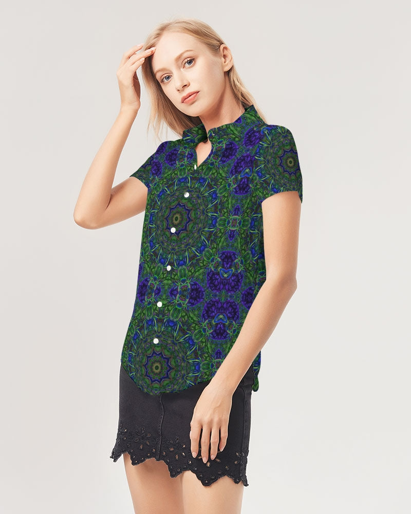 blue Green Ribbon Kaleidoscope Women's Short Sleeve Button Up