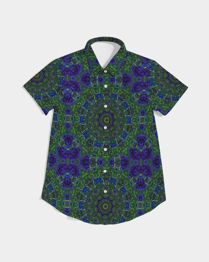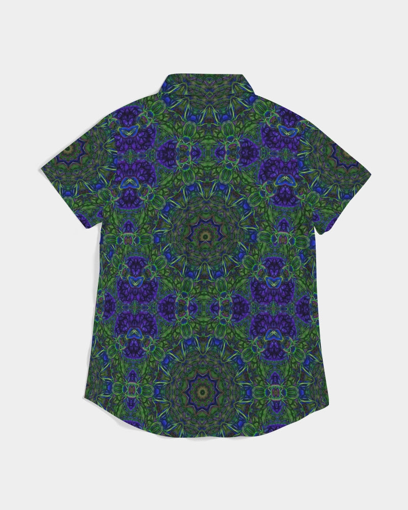 About The Artblue Green Ribbon Kaleidoscope Blue green ribbon woven look abstract kaleidoscope pattern. Product DetailsKeep it cute and classic in our Short Sleeve Button-Up Top, featuring lightweight woven fabric, a relaxed bodice, white buttons, and a curved hem. Pair with jeans and a blazer for a casual-chic workday look!