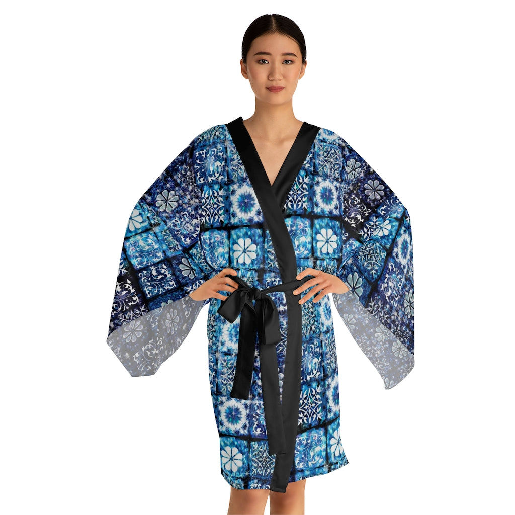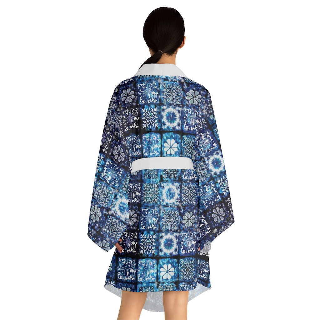 Blue Ice Crystals Motif Long Sleeve Kimono Robe