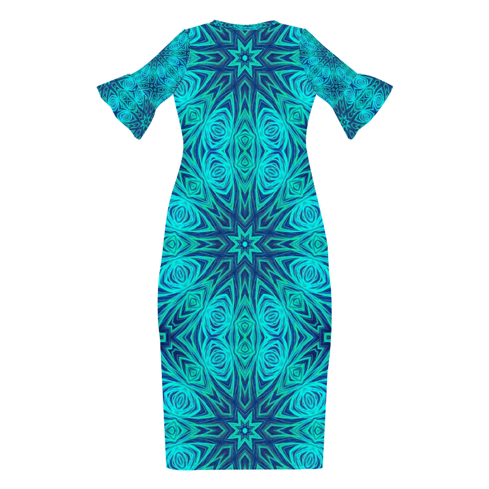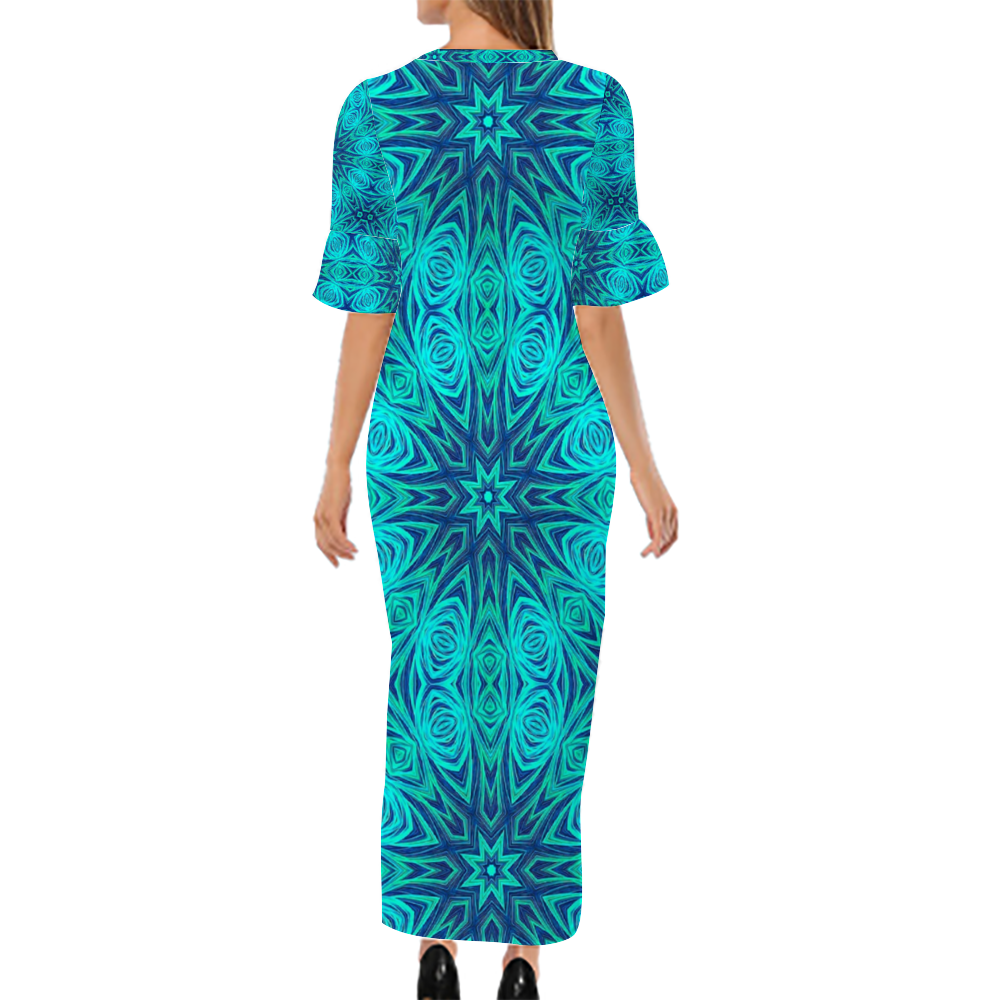 Blue Ice Fractal Kaleidoscope Custom Lotus Leaf Short Sleeve Long Dress Women's Summer Fashion Dress