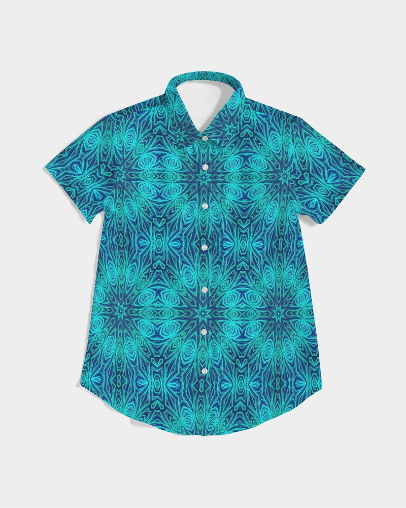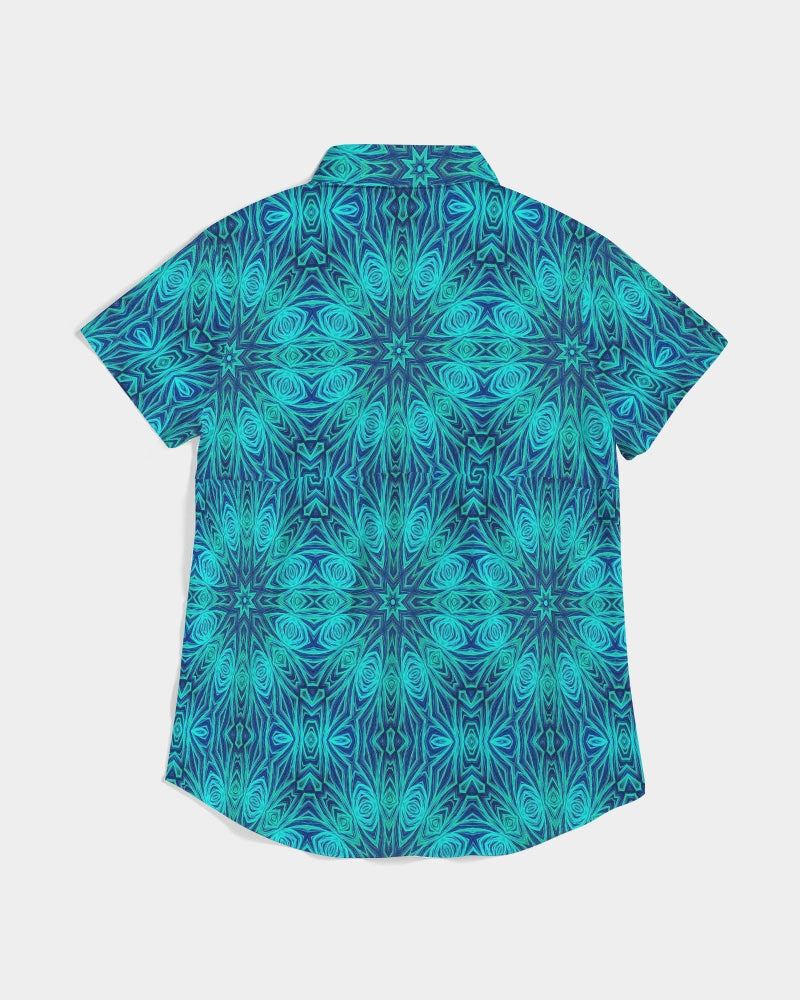 About The ArtBlue Ice Kaleidoscope Blue kaleidoscope pattern. Product DetailsKeep it cute and classic in our Short Sleeve Button-Up Top, featuring lightweight woven fabric, a relaxed bodice, white buttons, and a curved hem. Pair with jeans and a blazer for a casual-chic workday look!