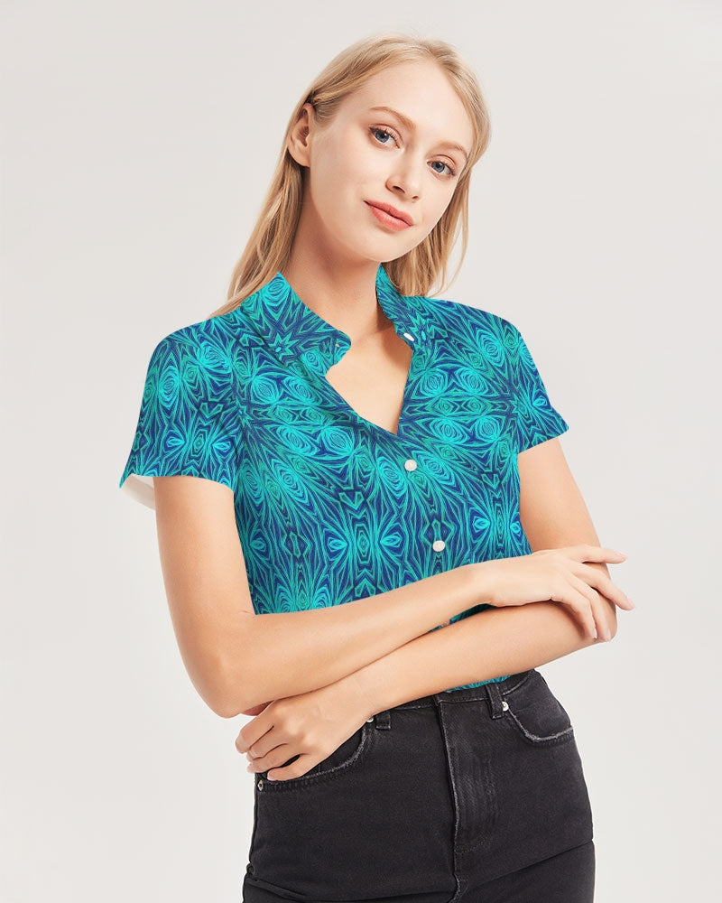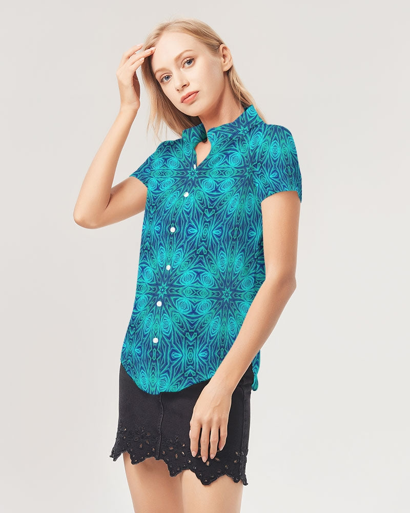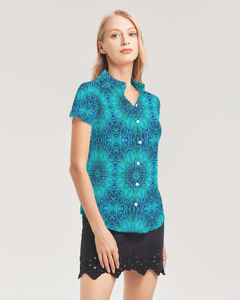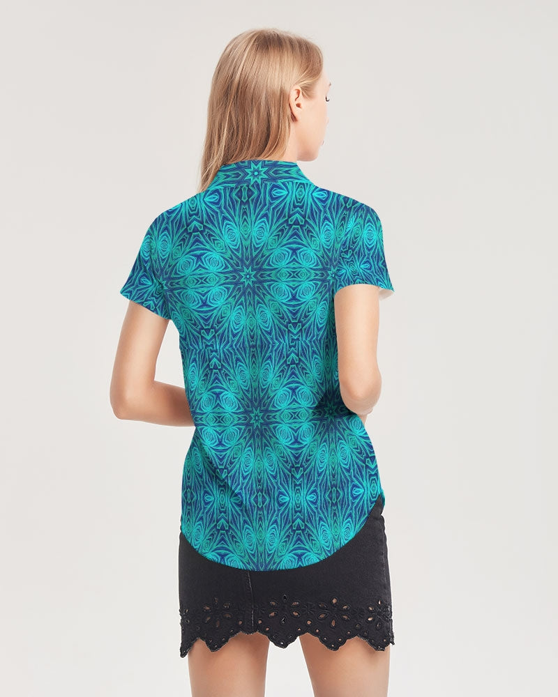 Blue Ice Kaleidoscope Women's All-Over Print Short Sleeve Button Up