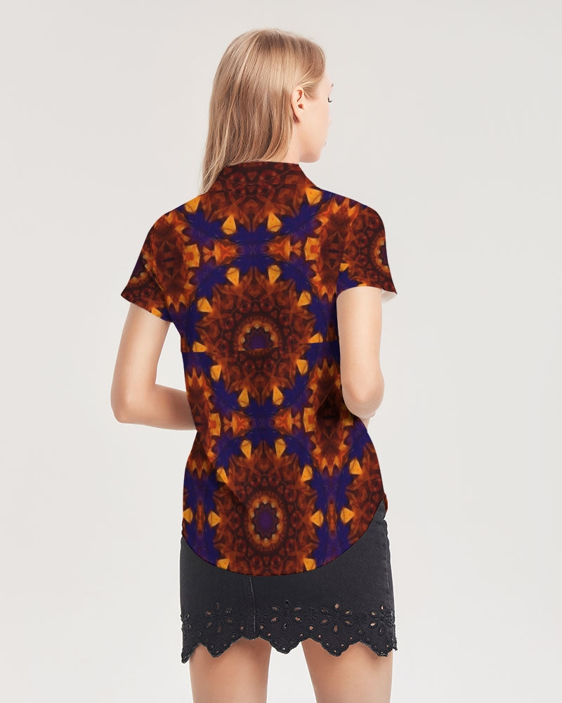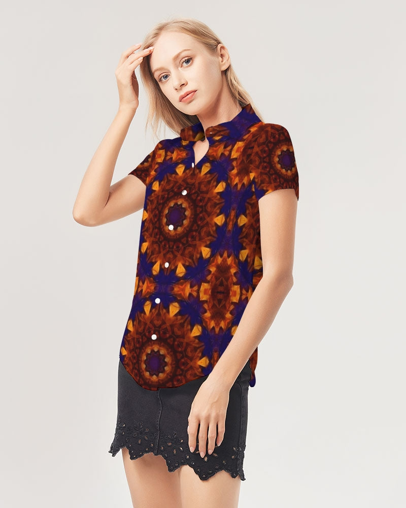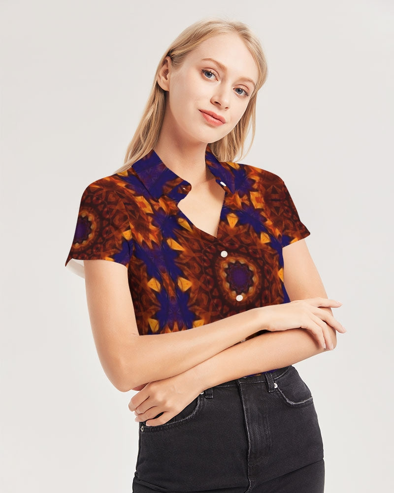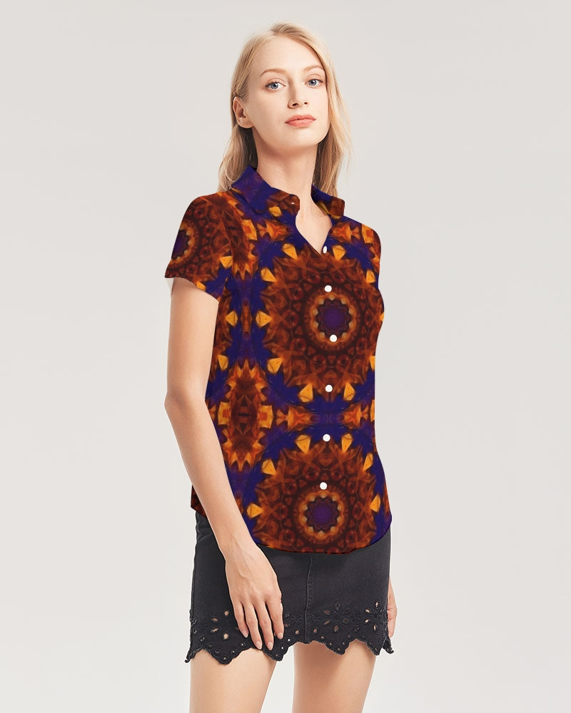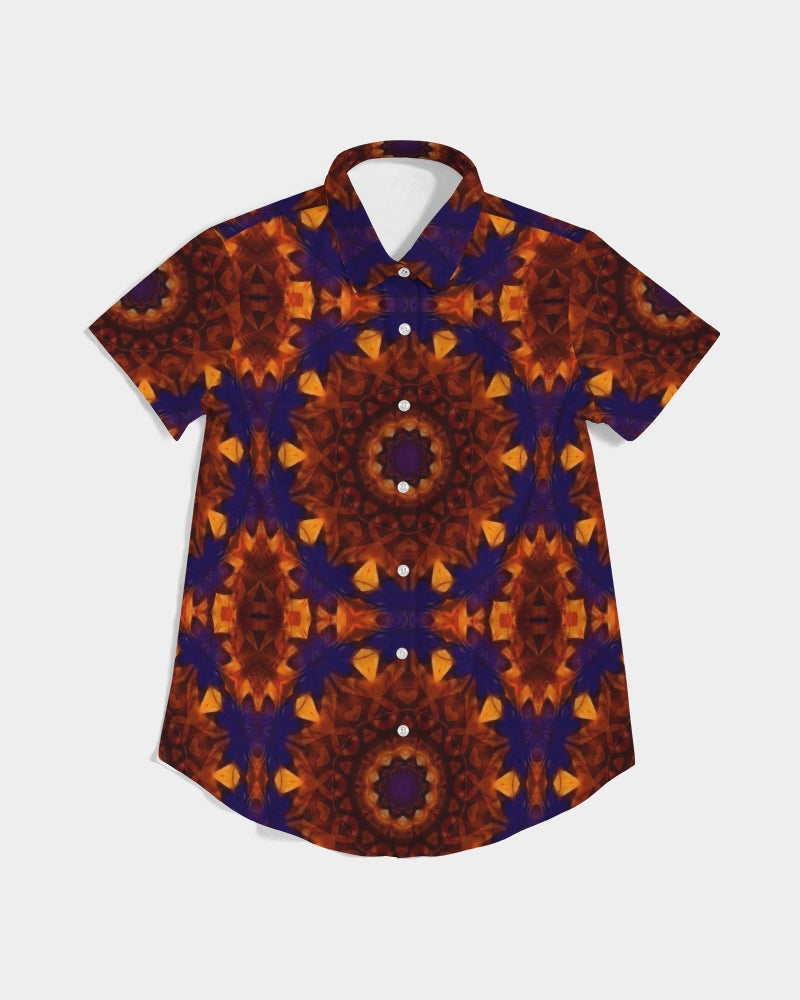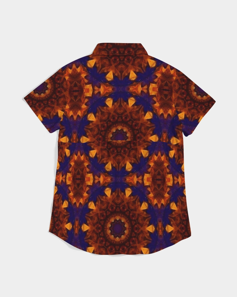 About The ArtBlue Orange Red Kaleidoscope Blue and orange kaleidoscope pattern. Product DetailsKeep it cute and classic in our Short Sleeve Button-Up Top, featuring lightweight woven fabric, a relaxed bodice, white buttons, and a curved hem. Pair with jeans and a blazer for a casual-chic workday look!