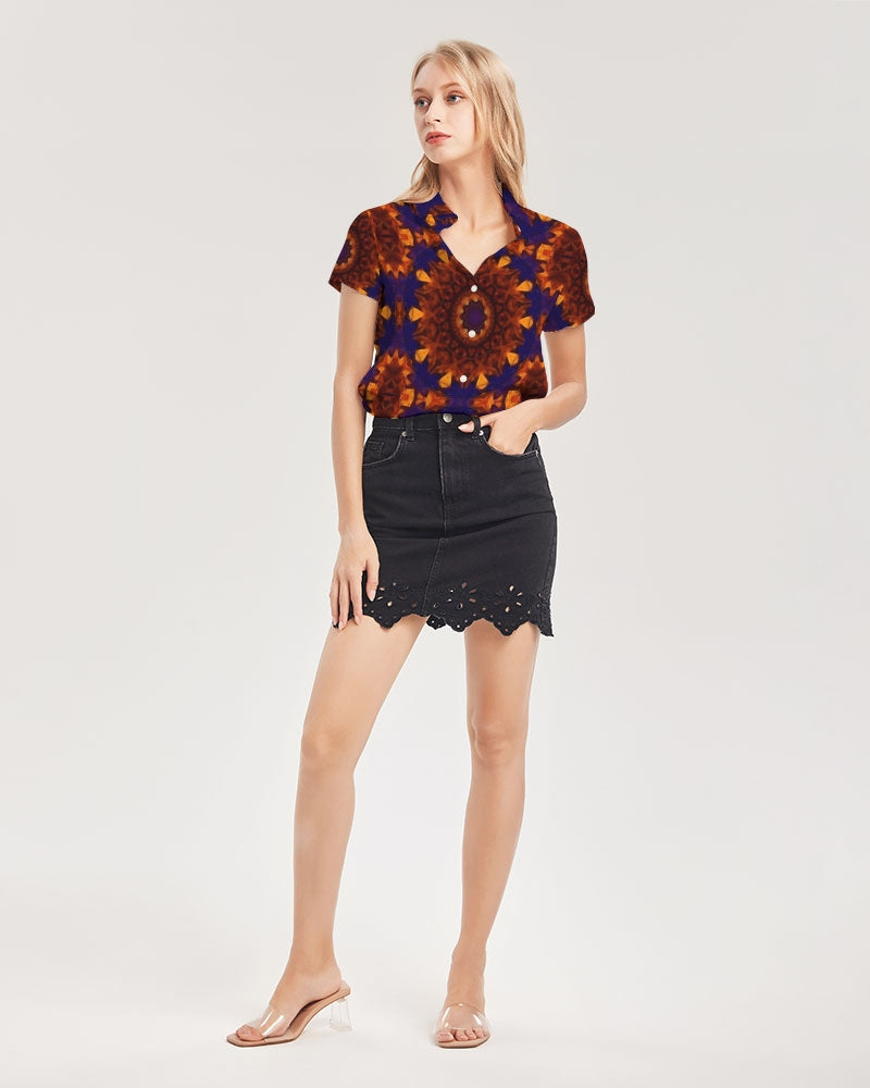 Blue Orange Red Kaleidoscope Women's All-Over Print Short Sleeve Button Up