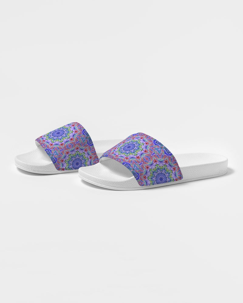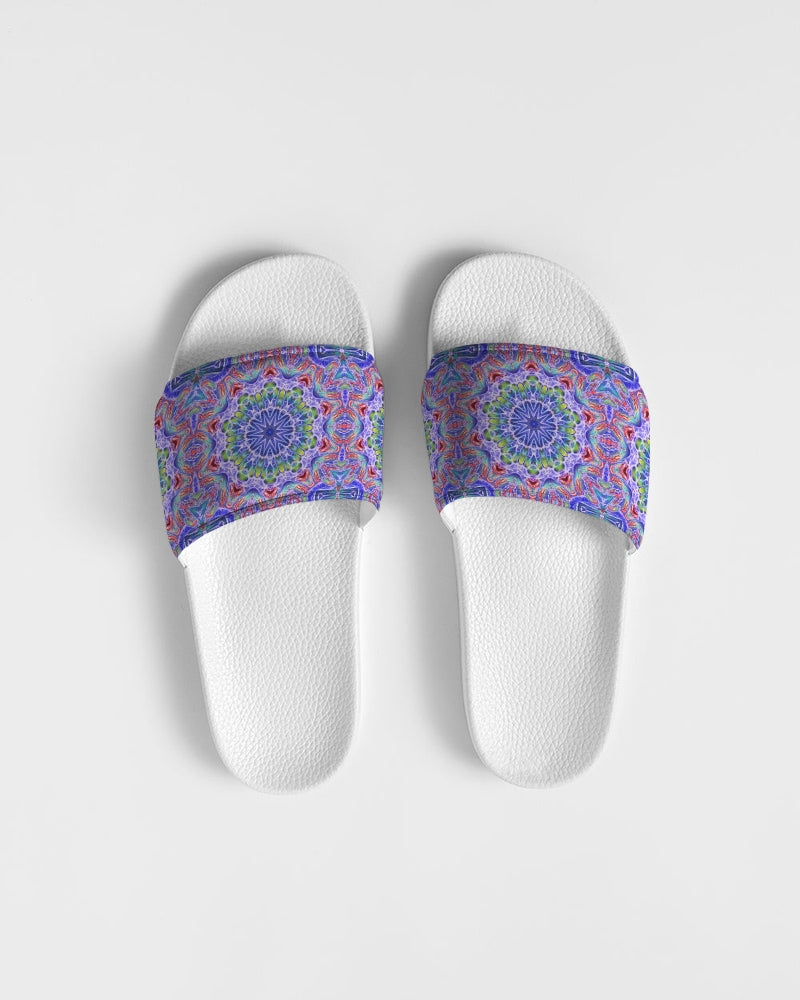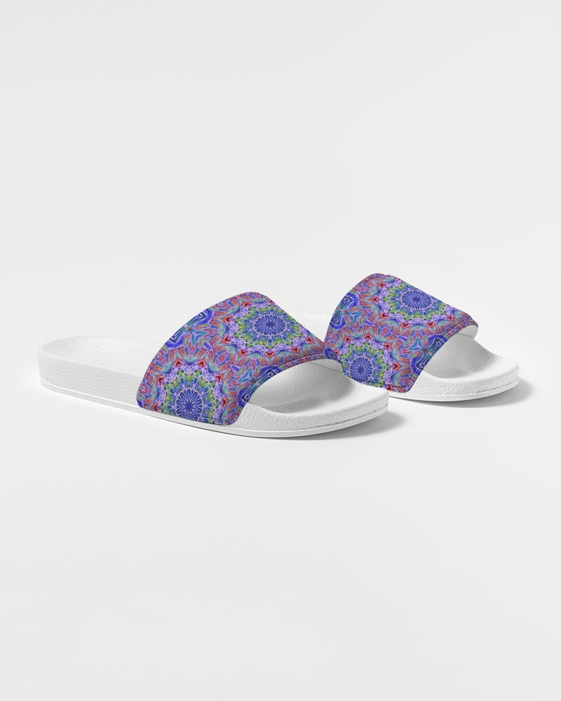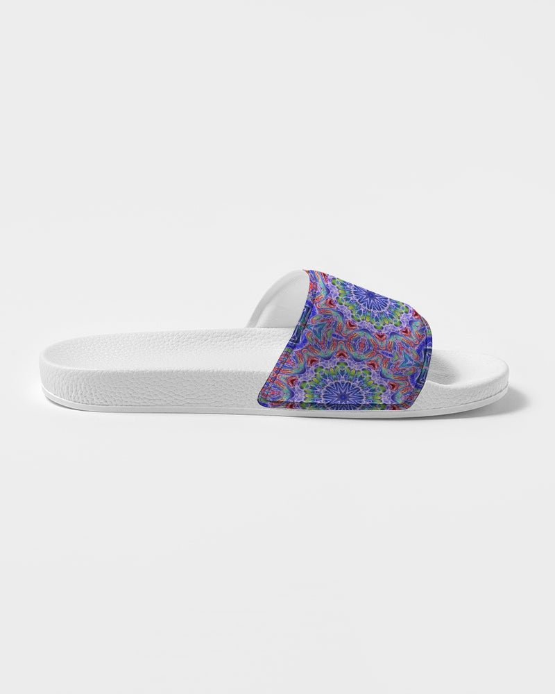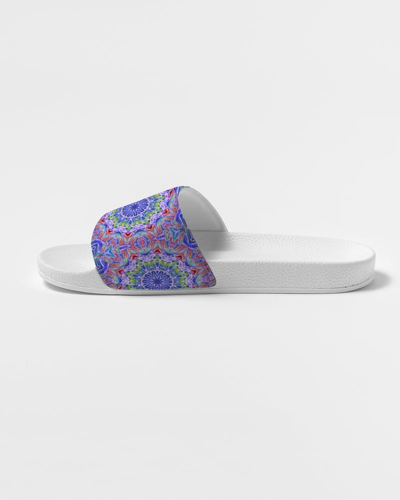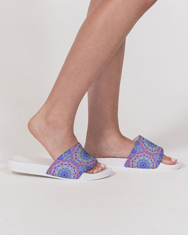 About The ArtBlue Red Kaleidoscope Blue and red kaleidoscope. Product DetailsSlip on your Women's Slide Sandals for easy and comfortable style. Made with a soft upper strap that conforms to the natural movement of your foot and a conshioned footbed for all day wear.