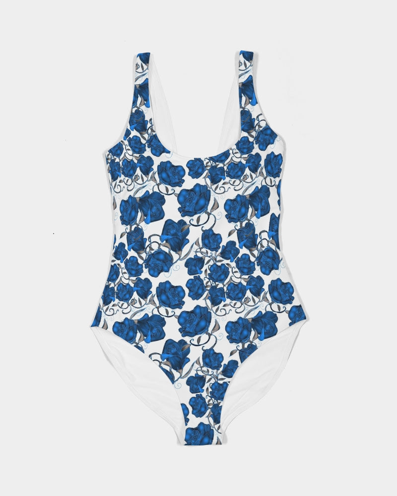 About The ArtBlue Roses Blue hand drawn roses and vines in repeating pattern. Product DetailsWith its simple scoop neck and modest cuts, our Women's One-Piece Swimsuit compliments all body types. Stretchy, padded, and built-in UPF 50+, this swimsuit offers excellent comfort, support, and UV protection.