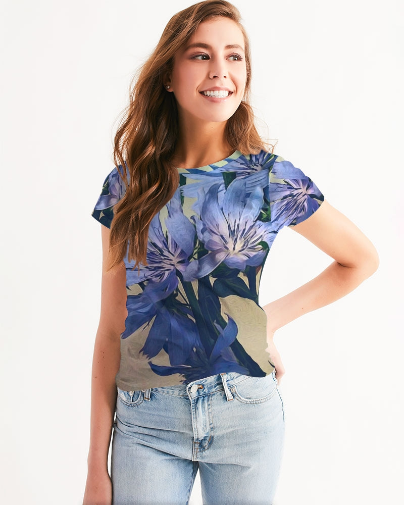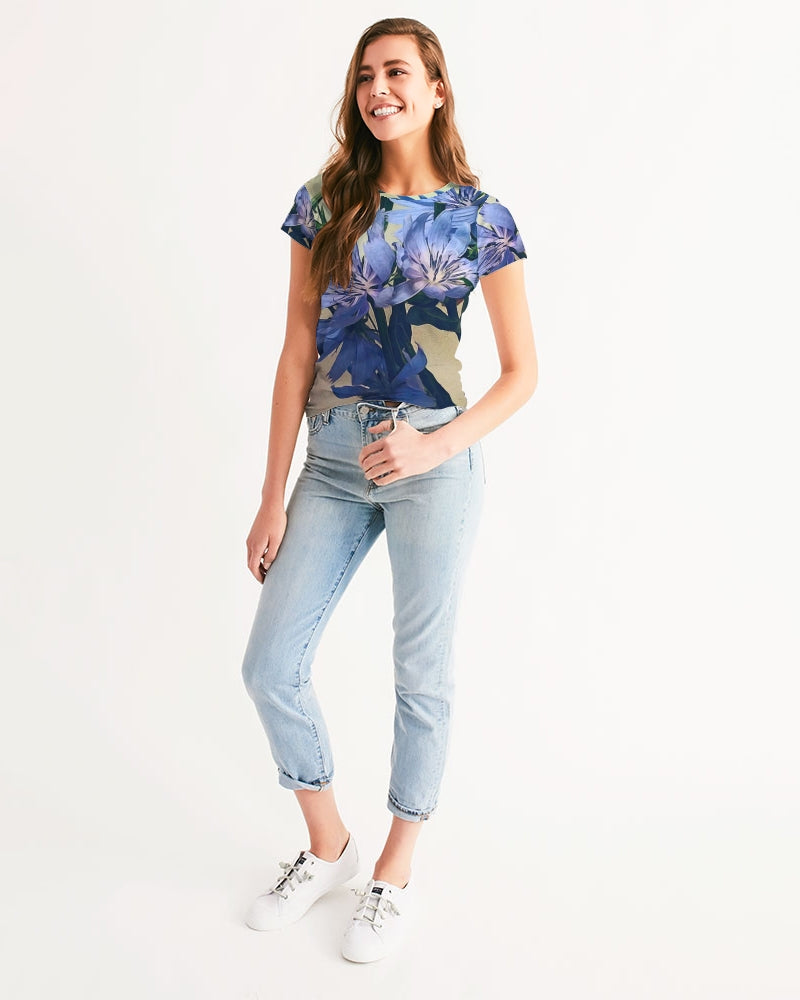 About The ArtBlue Wildflowers Blue wildflowers photograph art on yellow background. Product DetailsStep out with an instant classic! Dressed up or down, our fitted Women's Tee offers complete comfort and style. Handmade with premium wear resistent fabric, show off your curves with this carefully crafted tee.