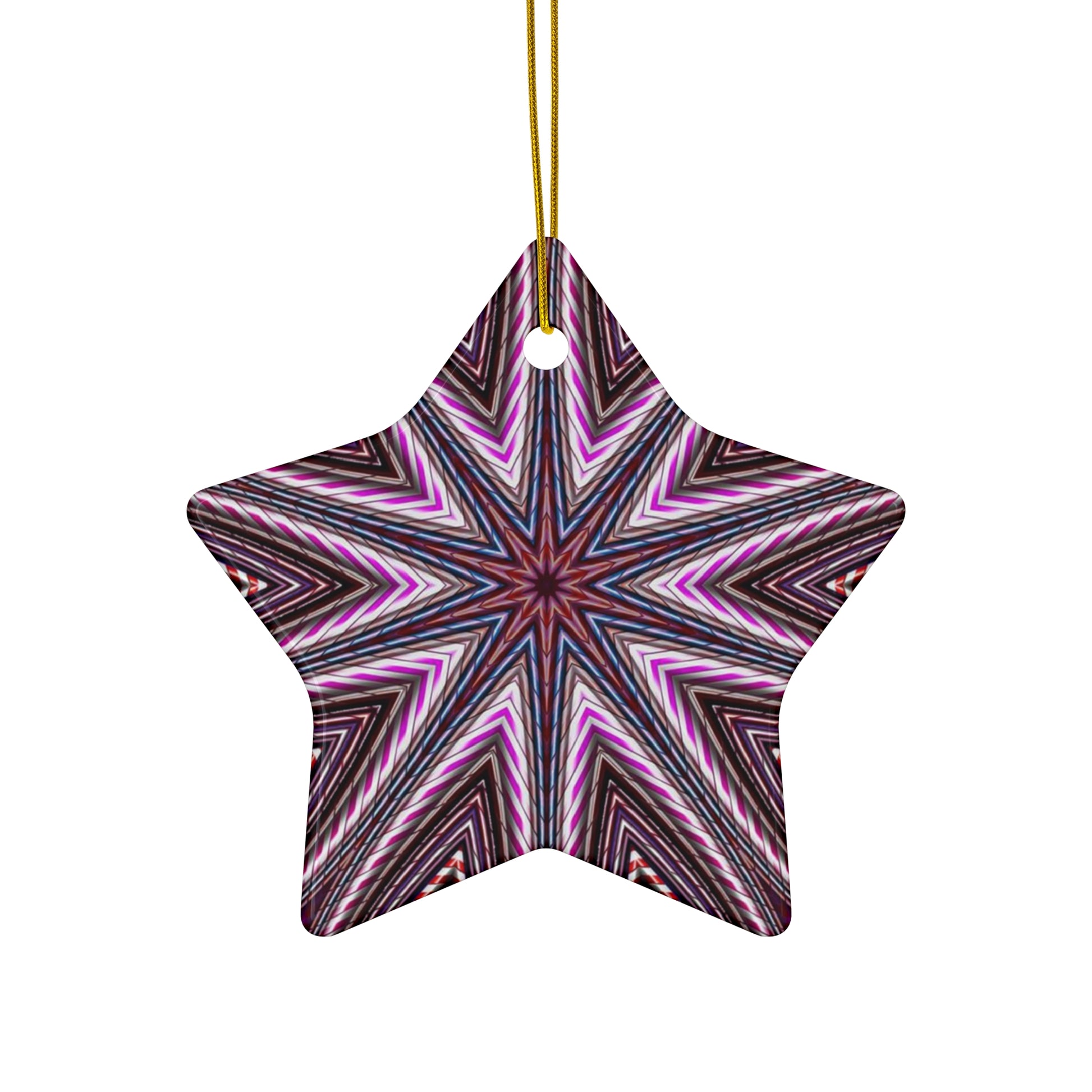 Handcrafted color meets celestial charm in this glossy ceramic ornament. The vivid starburst design radiates layered purples, pinks, and deep reds, printed with crisp detail that keeps every line sharp. Lightweight yet sturdy at 3mm thick, the single-piece ceramic keeps the image vibrant and resistant to wear. A small gold-toned string threads through the pre-drilled hole, letting the ornament sway gently on a tree branch, window latch, or cozy corner shelf. Bring a touch of kaleidoscopic warmth to quiet winter evenings or use it as a thoughtful accent for seasonal gatherings — each ornament arrives ready to hang and brighten a moment.