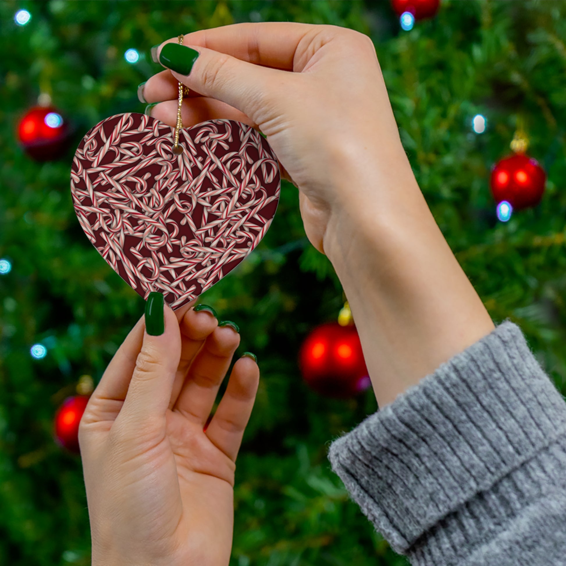 Handcrafted-feel ceramic ornament that brings a cozy, handcrafted touch to seasonal decor. The glossy, full-color print captures a dense, woven candy-cane pattern in warm red and ivory tones, lending a nostalgic, slightly rustic vibe. Lightweight yet sturdy at 3mm thick, each piece arrives ready to hang with a gold-toned string through a pre-drilled hole. Available in four classic shapes — snowflake, star, heart, and circle — this single-sided ornament slips easily into a collection or becomes a subtle standalone accent on a tree, wreath, or gift tag. The rich colors and solid one-piece construction mean it stays vibrant year after year, adding a familiar, comforting accent to winter gatherings and cozy holiday moments.