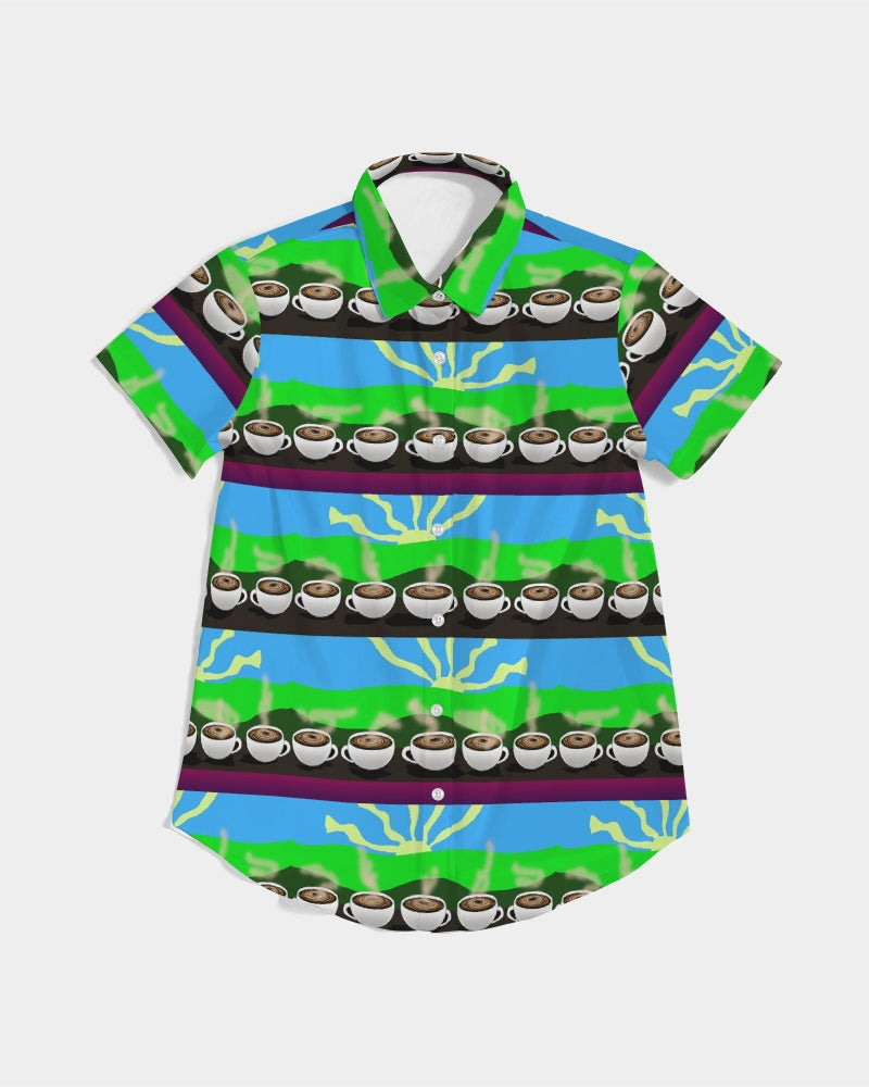 About The ArtCoffee Morning Pattern Coffee cups and a sunrise as if you left the cup on the windowsill and the sweet morning air came streaming in. Product DetailsKeep it cute and classic in our Short Sleeve Button-Up Top, featuring lightweight woven fabric, a relaxed bodice, white buttons, and a curved hem. Pair with jeans and a blazer for a casual-chic workday look!