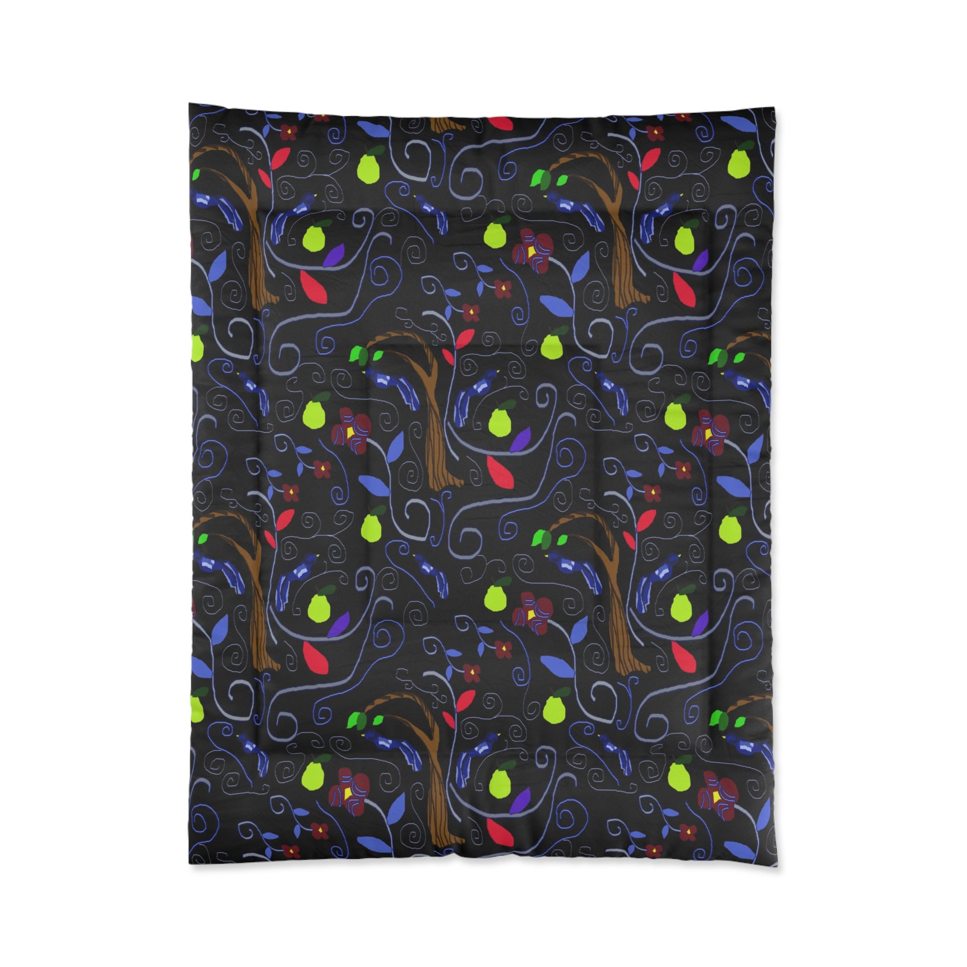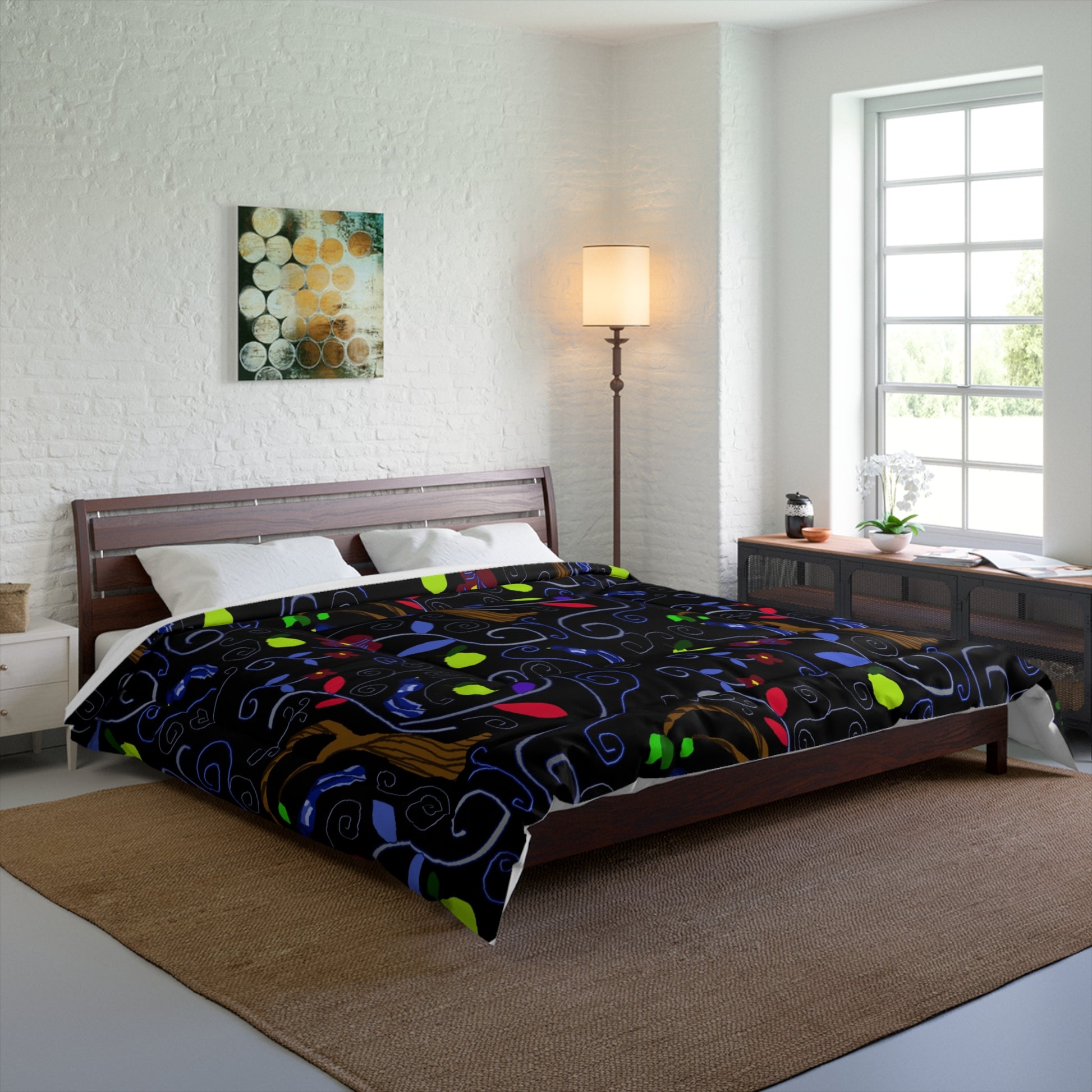Wrap yourself in a dreamy, artful comforter that turns bedtime into a quiet celebration of color and pattern. The dark, velvety background lets swirling vine-like motifs and jewel-toned leaves—lime, ruby, cobalt—pop like lanterns in the night. Lightweight yet cozy, the soft microfiber surface feels gentle against skin while the double square quilting keeps the loft and texture even across the whole piece. This comforter sits well in a modern bedroom or a cozy studio —it layers easily over a duvet or acts as a vibrant focal point on its own. Let it bring a cozy, whimsical energy to quiet mornings and late-night reading sessions, or tuck it in for restful sleep after a busy day.