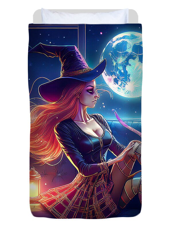 Enchanting Witch in Moonlit Room - Duvet Cover