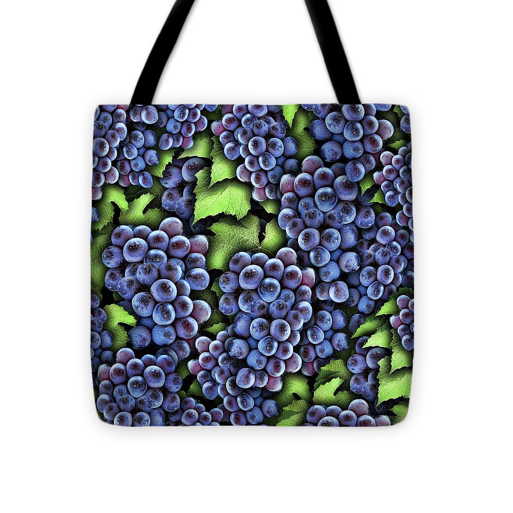 Purchase a tote bag featuring the digital art "Grapes Pattern" by Cindy Boyd. Our tote bags are made from soft, durable, poly-poplin fabric and include a 1" black strap for easy carrying on your shoulder. All seams are double-stitched for added durability. Each tote bag is machine-washable in cold water and is printed on both sides using the same image.