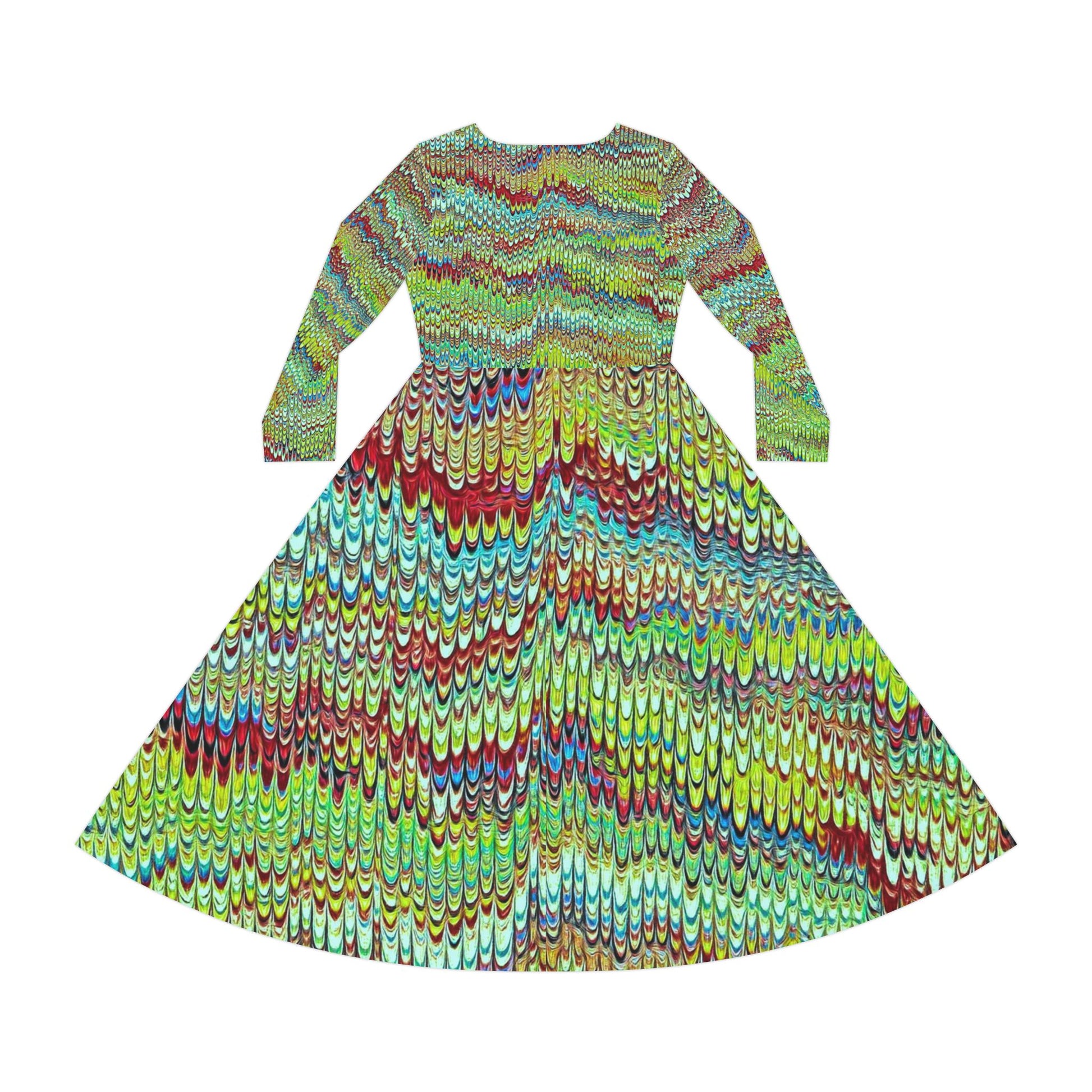 Green Marbling AOP Women's Dance Dress - Colorful Long Sleeve Dress for Parties, Events, Celebrations, Casual Outings, Dance Classes