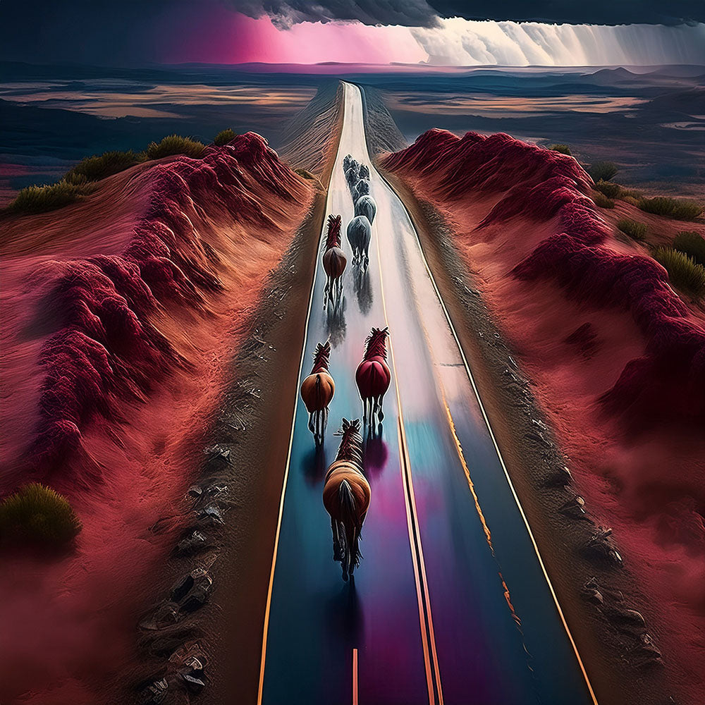 Ai image of horses running down a desert road. Done in Firefly.