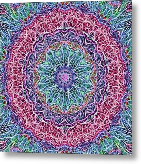 Kaleidoscope 115 metal print by Cindy Boyd. Bring your artwork to life with the stylish lines and added depth of a metal print. Your image gets printed directly onto a sheet of 1/16" thick aluminum. The aluminum sheet is offset from the wall by a 3/4" thick wooden frame which is attached to the back. The high gloss of the aluminum sheet complements the rich colors of any image to produce stunning results.