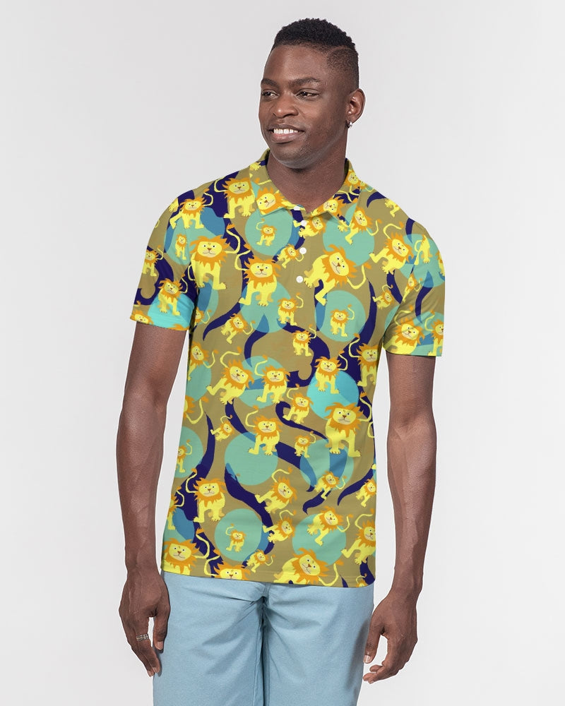 About The ArtLion Pattern Lions with pale blue green polkadots and a sandy river abstracted background. Product DetailsLook sharp in this versatile polo, perfect for business casual or a polished weekender outfit. Our Men's Slim Fit Short Sleeve Polo features soft, breathable fabric with a close cut torso, tailored to show your natural physique.