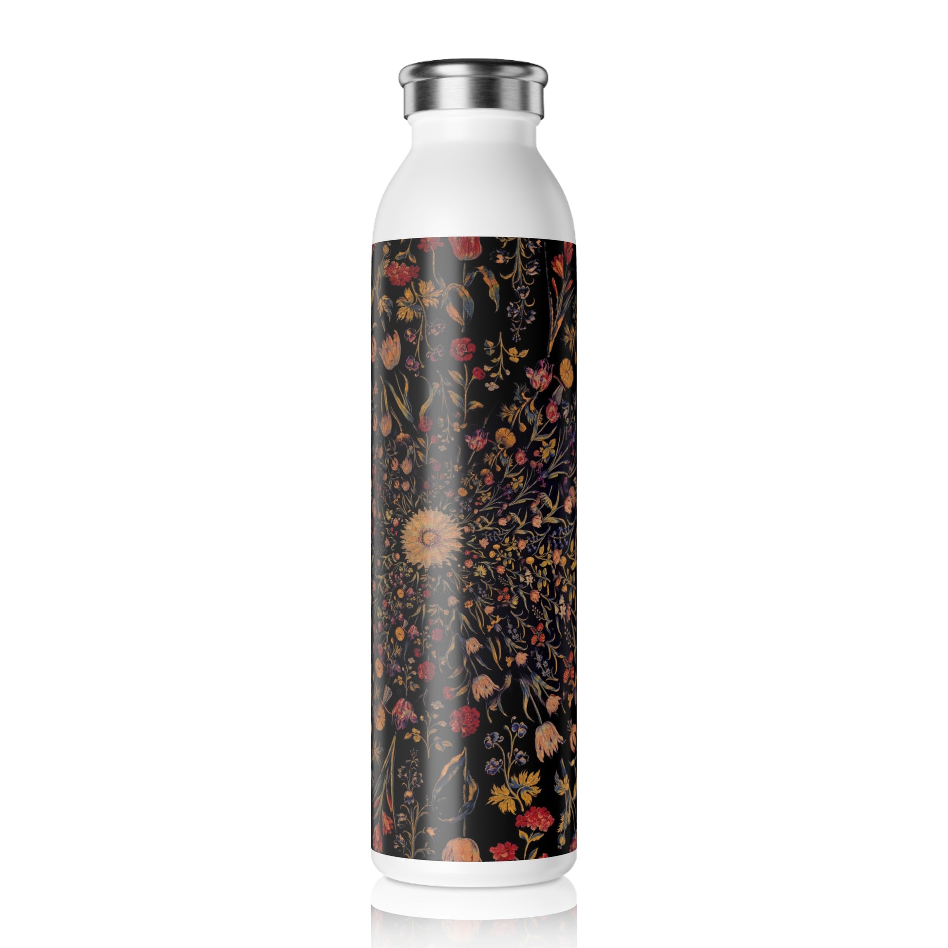 Medieval Flowers On Black Slim Water Bottle - Stylish Drinkware for Yoga, Gifts for Her, Eco-Friendly Hydration, Summer Accessory, Travel Essential