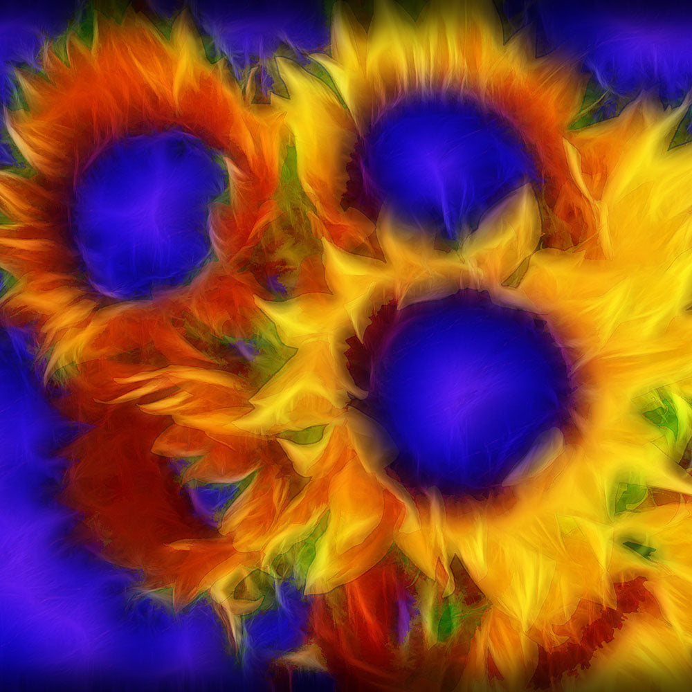 Cobalt blue sunflowers with bright yellow petals. Filtered photograph.