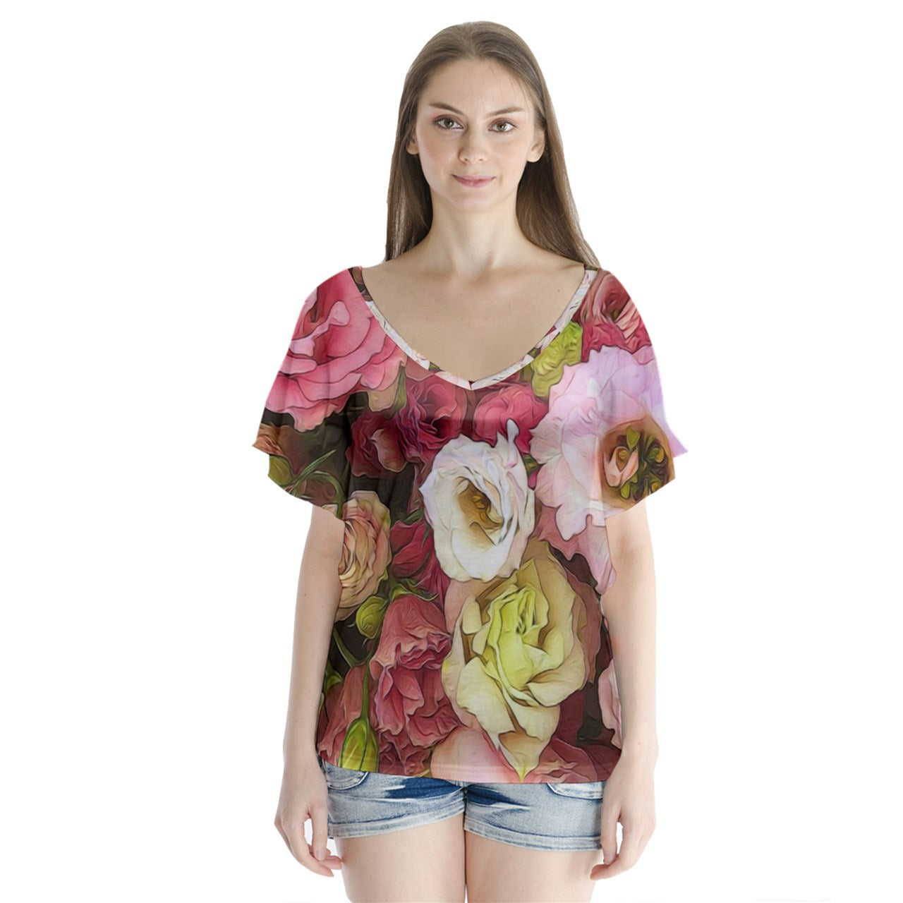 Pink Lisianthus Flowers V-Neck Flutter Sleeve Top