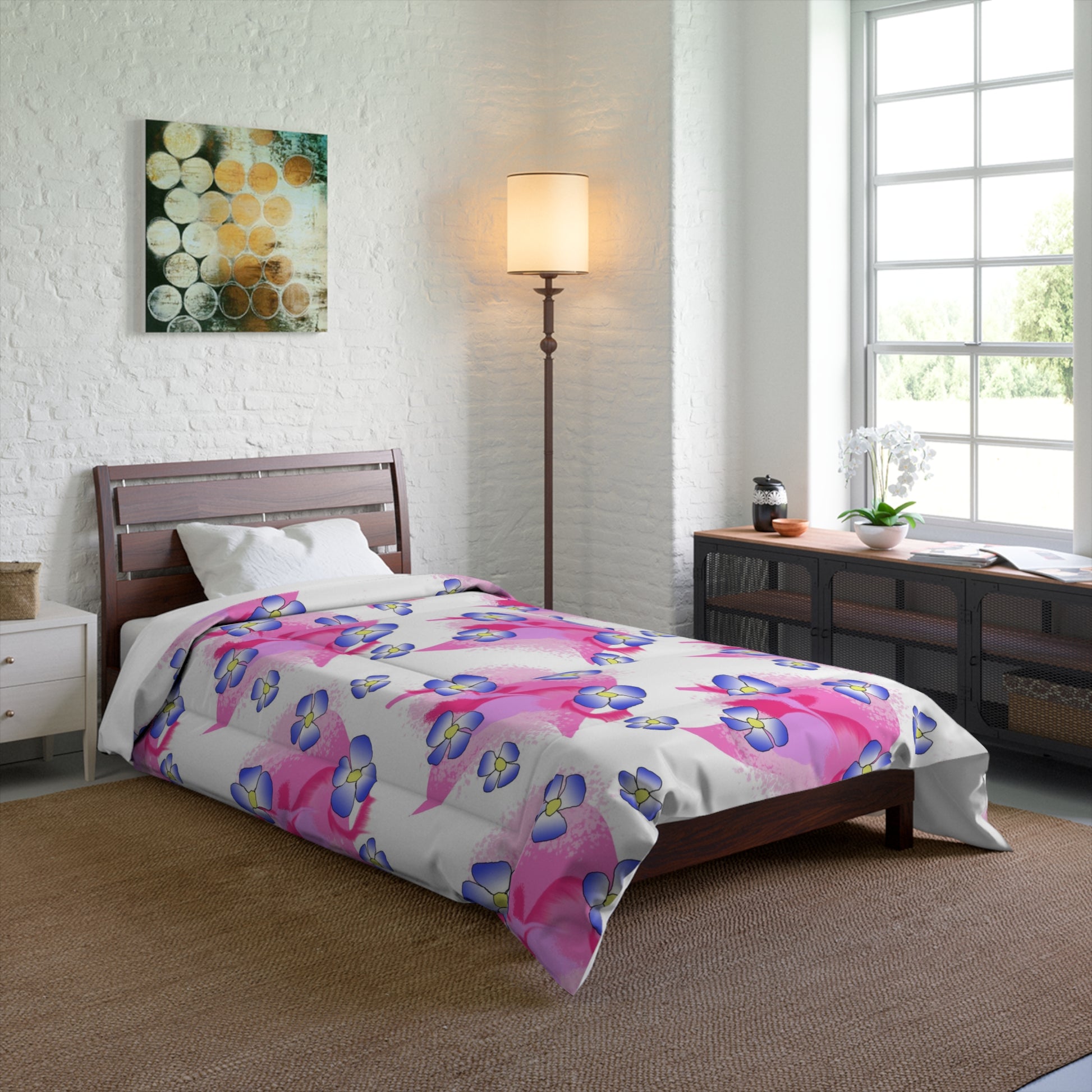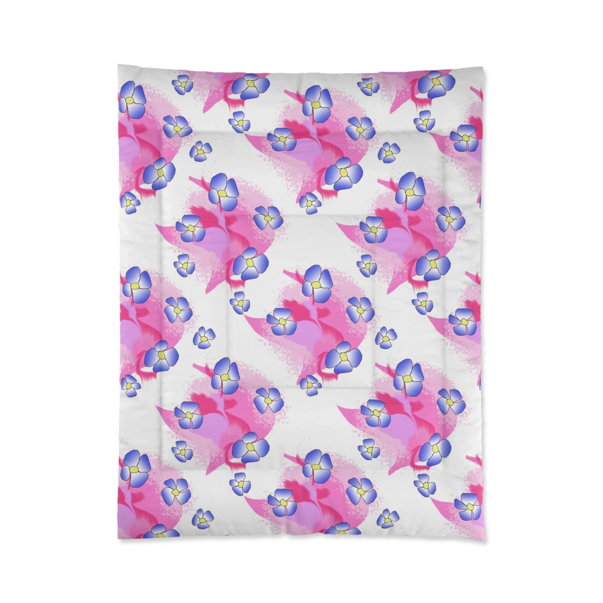 Slide into a quiet, joyful morning wrapped in soft watercolor blooms. This comforter blends airy pink washes with small violet blossoms to create a light, feminine look that brightens a simple bedroom without shouting. It feels weightless on the bed — breathable and easy to layer — and the vivid one-sided print keeps the pattern fresh and painterly. Imagine sinking into sheets after a long day and waking to a gentle palette that nudges you toward calm and creativity. For someone who values artful details and a peaceful, cozy room, this comforter reads like a soft exhale and an everyday touch of charm for morning light or a relaxed weekend slow-start.