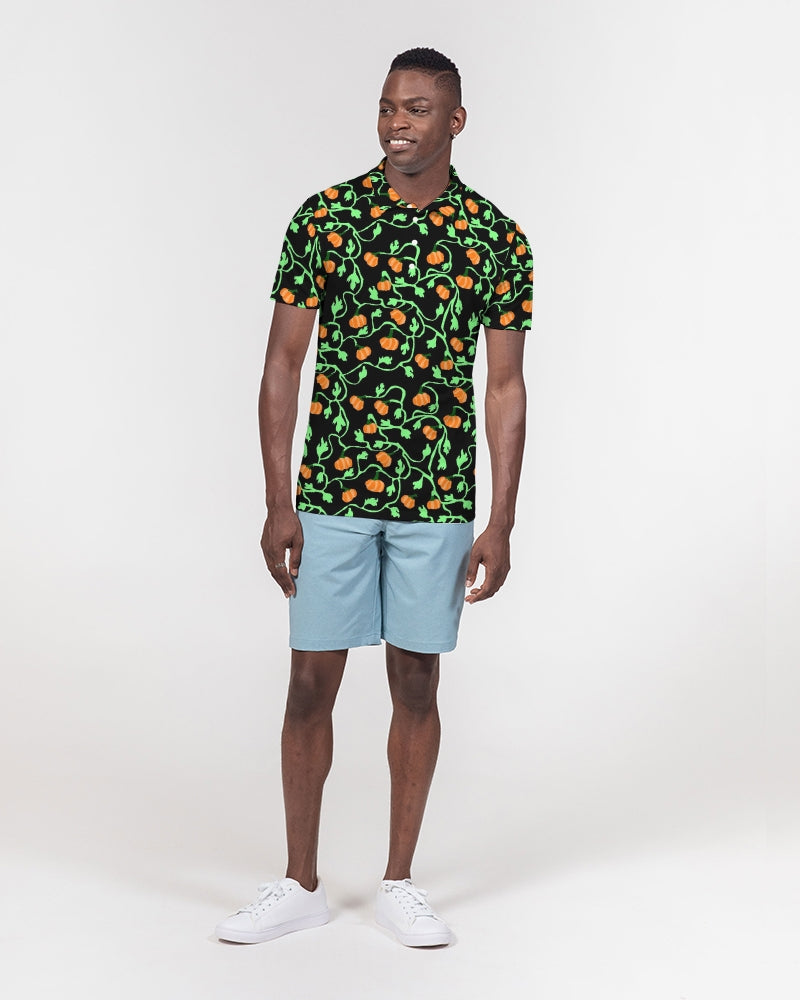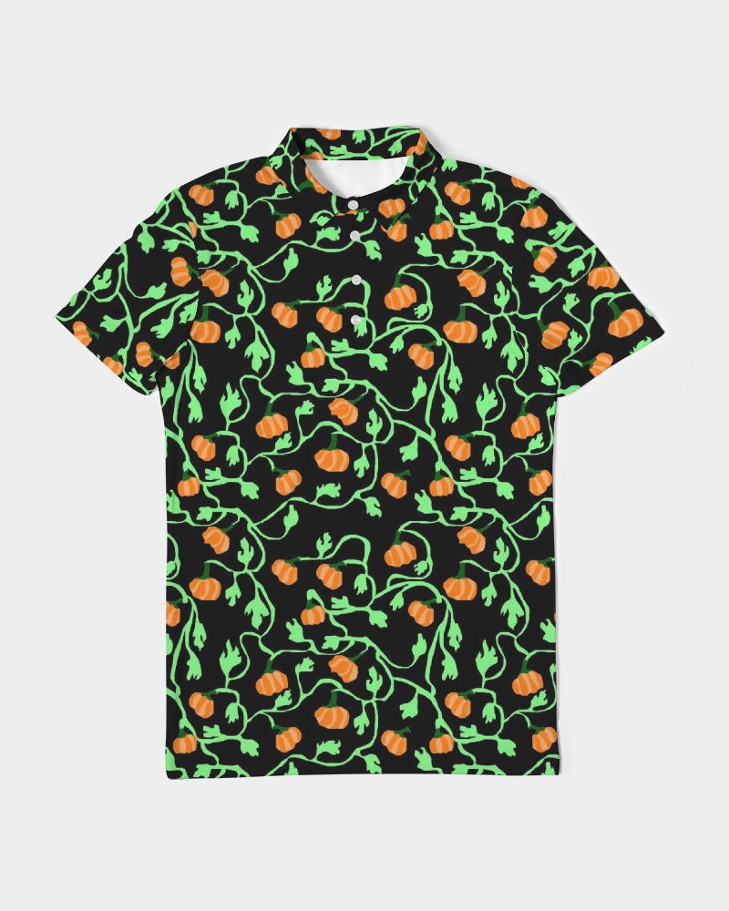 About The ArtPumpkin and Vines Patttern Pumpkins and vines in repeating pattern on black. Perfect for fall and Halloween decor. Product DetailsLook sharp in this versatile polo, perfect for business casual or a polished weekender outfit. Our Men's Slim Fit Short Sleeve Polo features soft, breathable fabric with a close cut torso, tailored to show your natural physique.