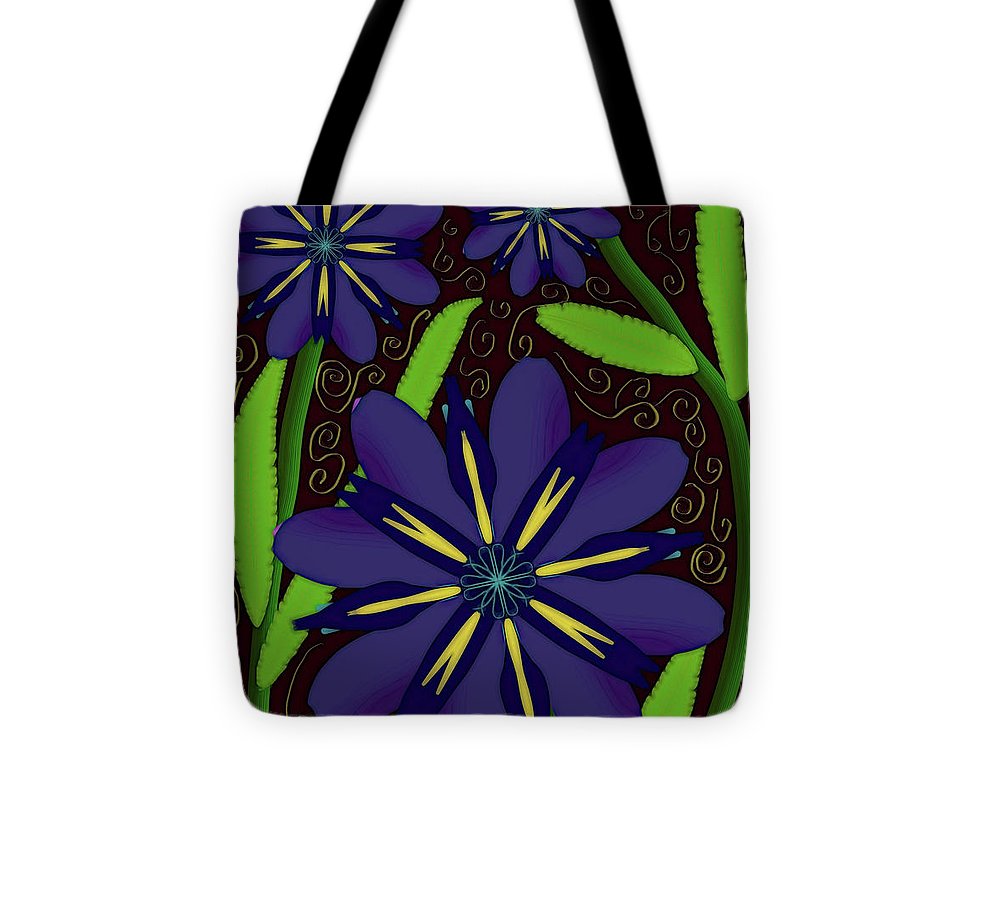 Purchase a tote bag featuring the digital art "Purple Flowers Yellow Swirls" by Cindy Boyd.   Our tote bags are made from soft, durable, poly-poplin fabric and include a 1" black strap for easy carrying on your shoulder.   All seams are double-stitched for added durability.   Each tote bag is machine-washable in cold water and is printed on both sides using the same image.