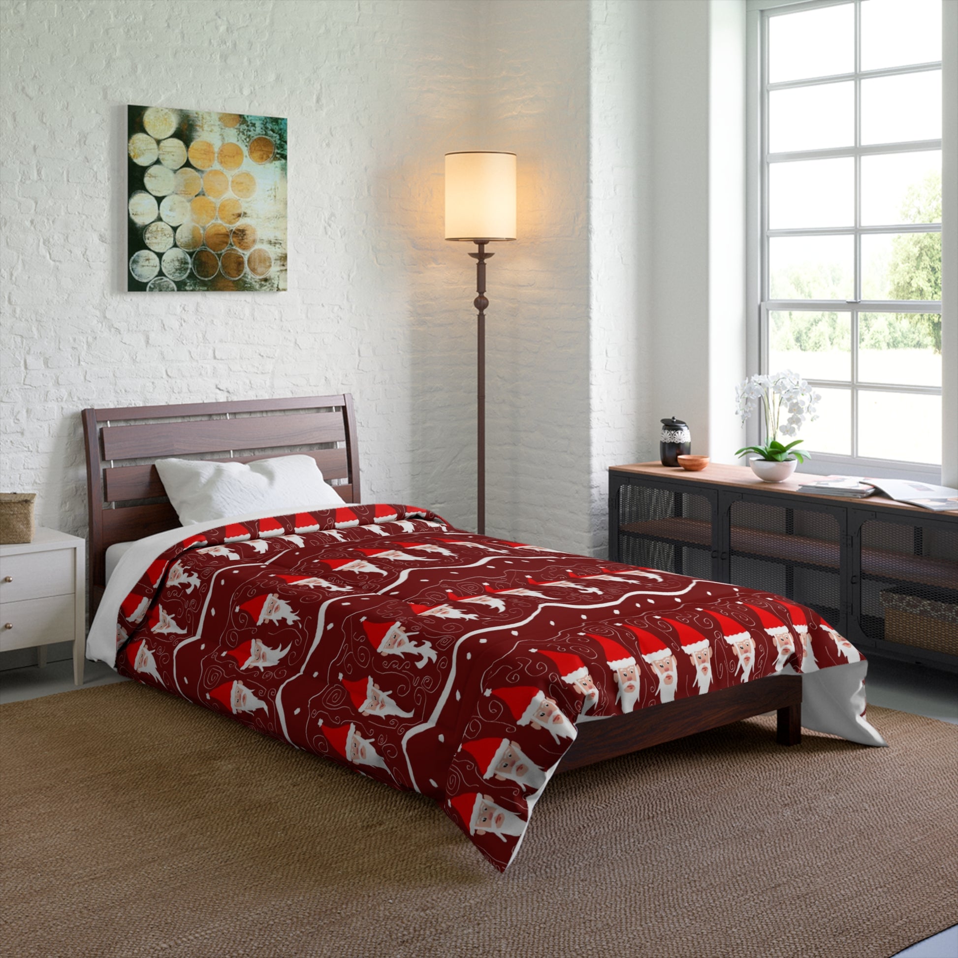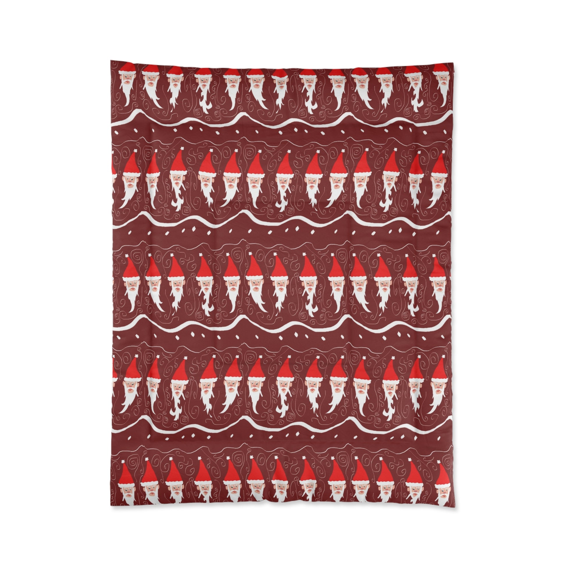 Wrap yourself in warm holiday cheer. This soft polyester comforter carries a hand-drawn gnome pattern across a rich, wine-red field, bringing a quiet, cozy charm to chilly evenings. The double square quilting keeps the lightweight batting evenly distributed so the texture stays smooth and comforting. Use it to layer over a duvet or drape it across the end of a bed for a festive pop of color. The one-sided print and bright white backing keep the look clean while letting the playful gnome rows take center stage. It feels like a slow evening by the fire — snug, simple, and just a little whimsical.