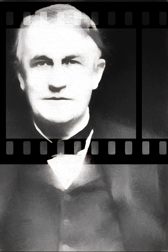 Iconic image of Thomas Edison with paint filters creating a texture and film strip frame.