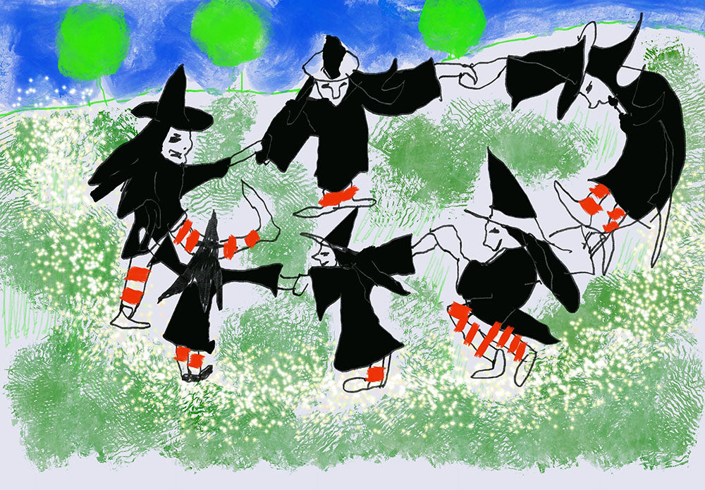 folk art version of simple drawn witches dancing in a circle to add to your Halloween decor.