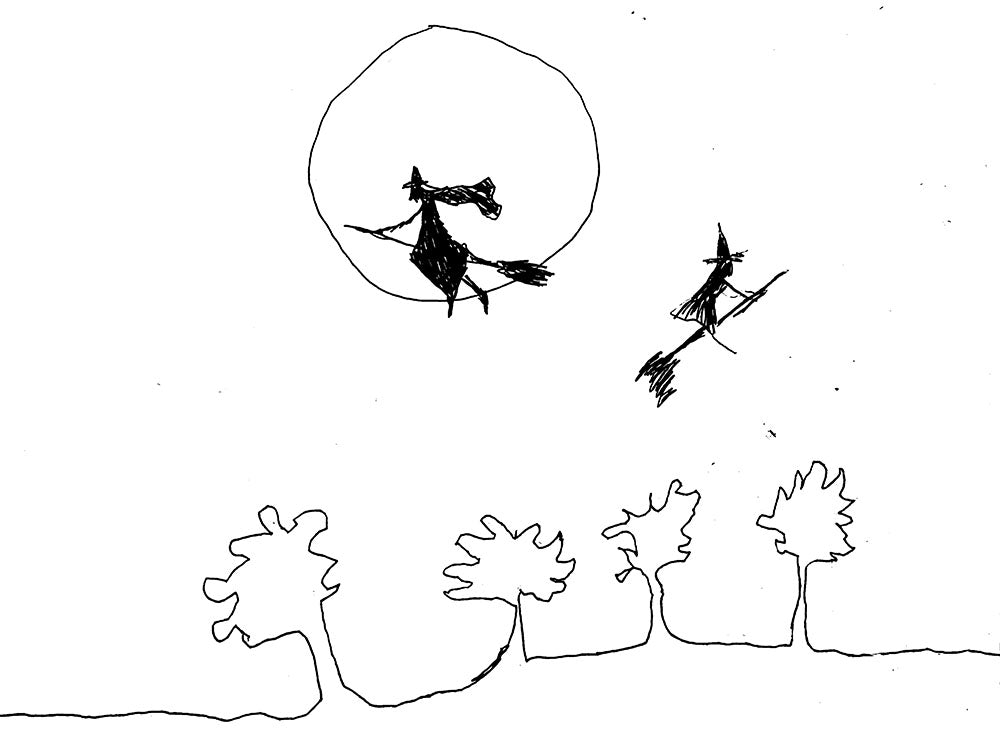 Pen and ink drawing of a sky with witches flying across the moon with minimilast trees and line art. I used threshold settings on photoshop to make the two color drawing from a photograph of actual paper.