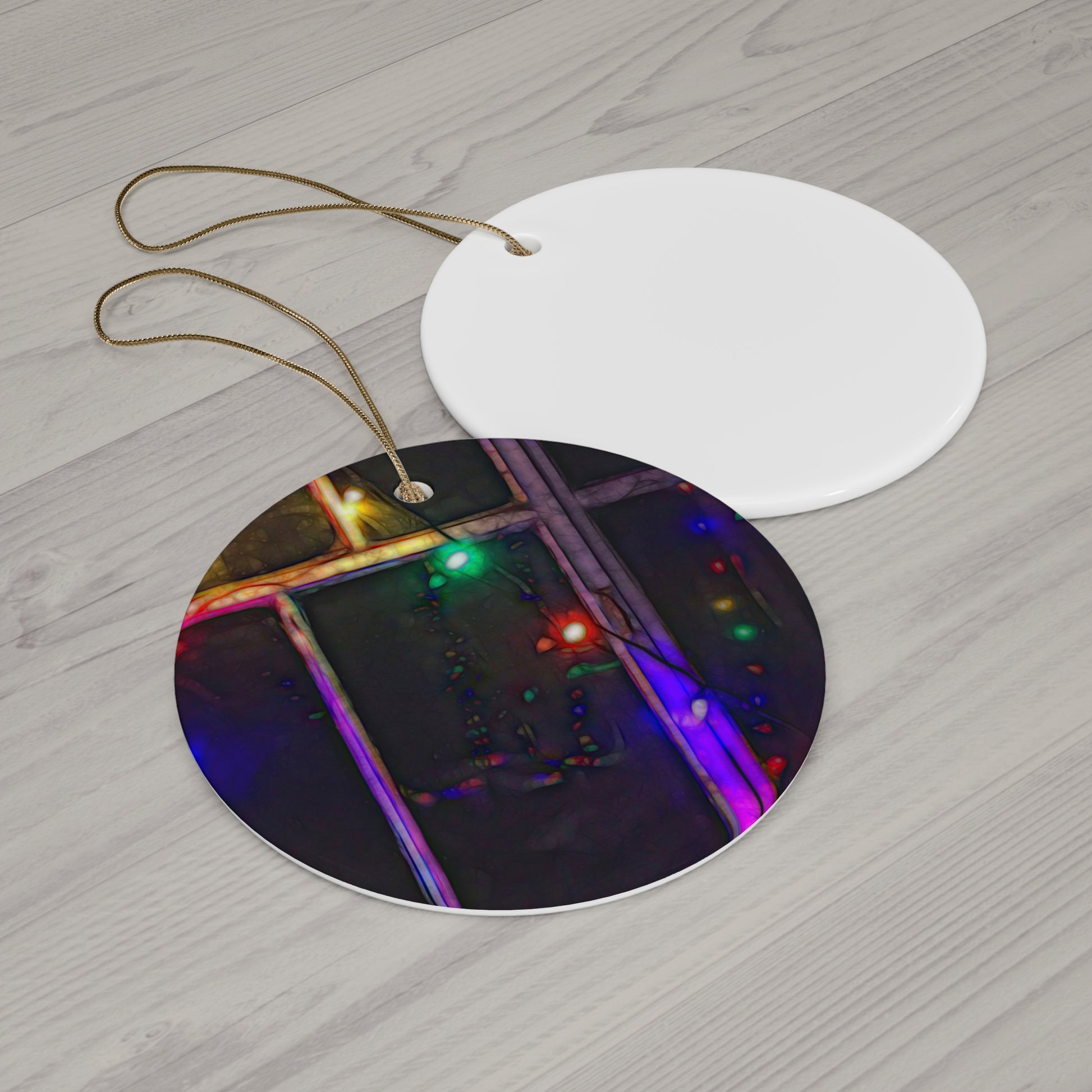 Hold a small, luminous moment of holiday magic. This ceramic star ornament catches light and color with a glossy finish that makes the printed string lights shimmer like a tiny window into an evening scene. Lightweight yet sturdy, it hangs from a gold-toned string and reads like a keepsake: a single-sided, vibrant art print on thick white ceramic that brightens a tree, a wall hook, or a gift tag. The smooth gloss reflects nearby lights and adds depth to the saturated colors, so each glance feels like discovering a familiar, cozy corner of winter night.