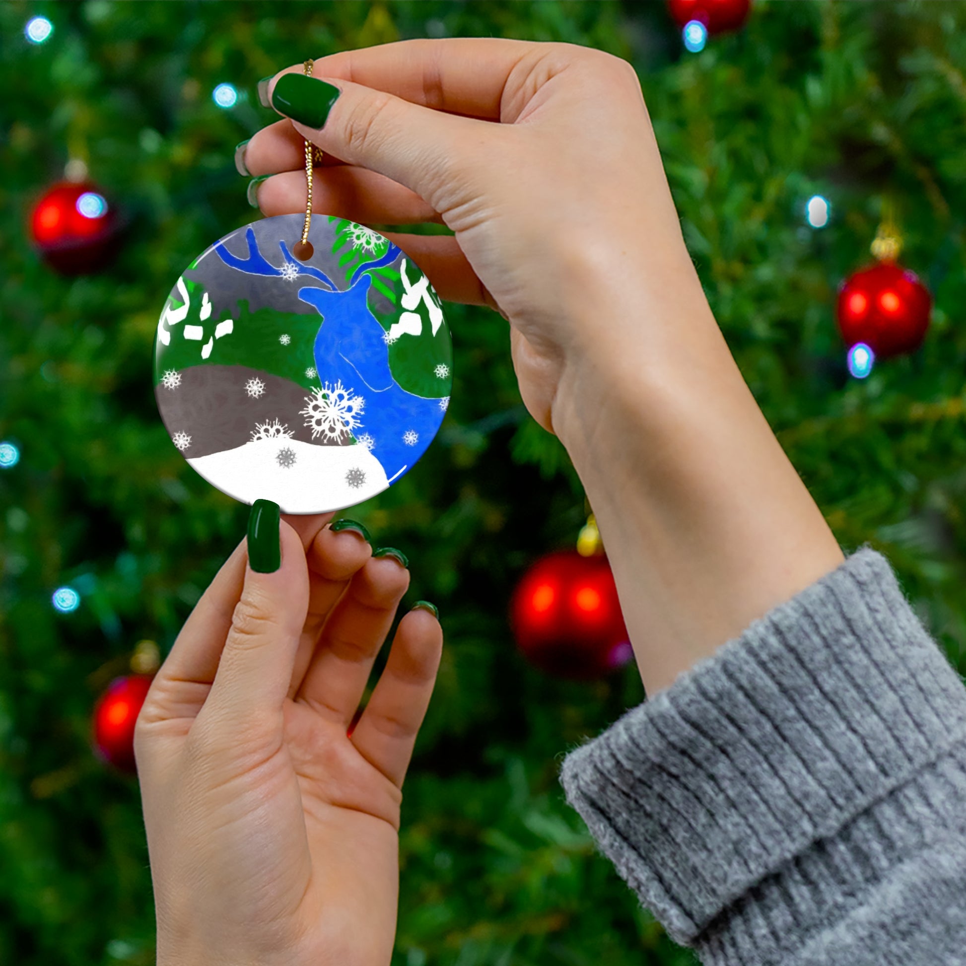 This glossy ceramic ornament brings a splash of handcrafted charm to seasonal decor. Printed in vivid, fade-resistant color on one side, the ceramic piece captures a wintry scene with playful blue and green tones and delicate snowflake accents. Each ornament is solid one-piece ceramic, 3mm thick, and finished with a shiny glaze that highlights the artwork’s colors. A pre-drilled hole and gold-toned hanging string are included so it can hang easily on a tree, garland, or wall. Available in four shapes—Snowflake, Star, Heart, and Circle—this single ornament pack lets you choose a silhouette that suits your space and style.