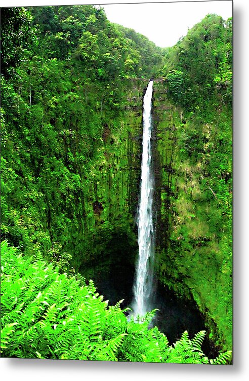 Waterfall Hawaii metal print by Cindy Boyd. Bring your artwork to life with the stylish lines and added depth of a metal print. Your image gets printed directly onto a sheet of 1/16" thick aluminum. The aluminum sheet is offset from the wall by a 3/4" thick wooden frame which is attached to the back. The high gloss of the aluminum sheet complements the rich colors of any image to produce stunning results.