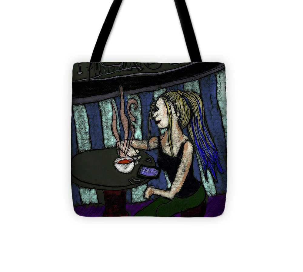 Purchase a tote bag featuring the digital art "Woman In a Cafe" by Cindy Boyd. Our tote bags are made from soft, durable, poly-poplin fabric and include a 1" black strap for easy carrying on your shoulder. All seams are double-stitched for added durability. Each tote bag is machine-washable in cold water and is printed on both sides using the same image.