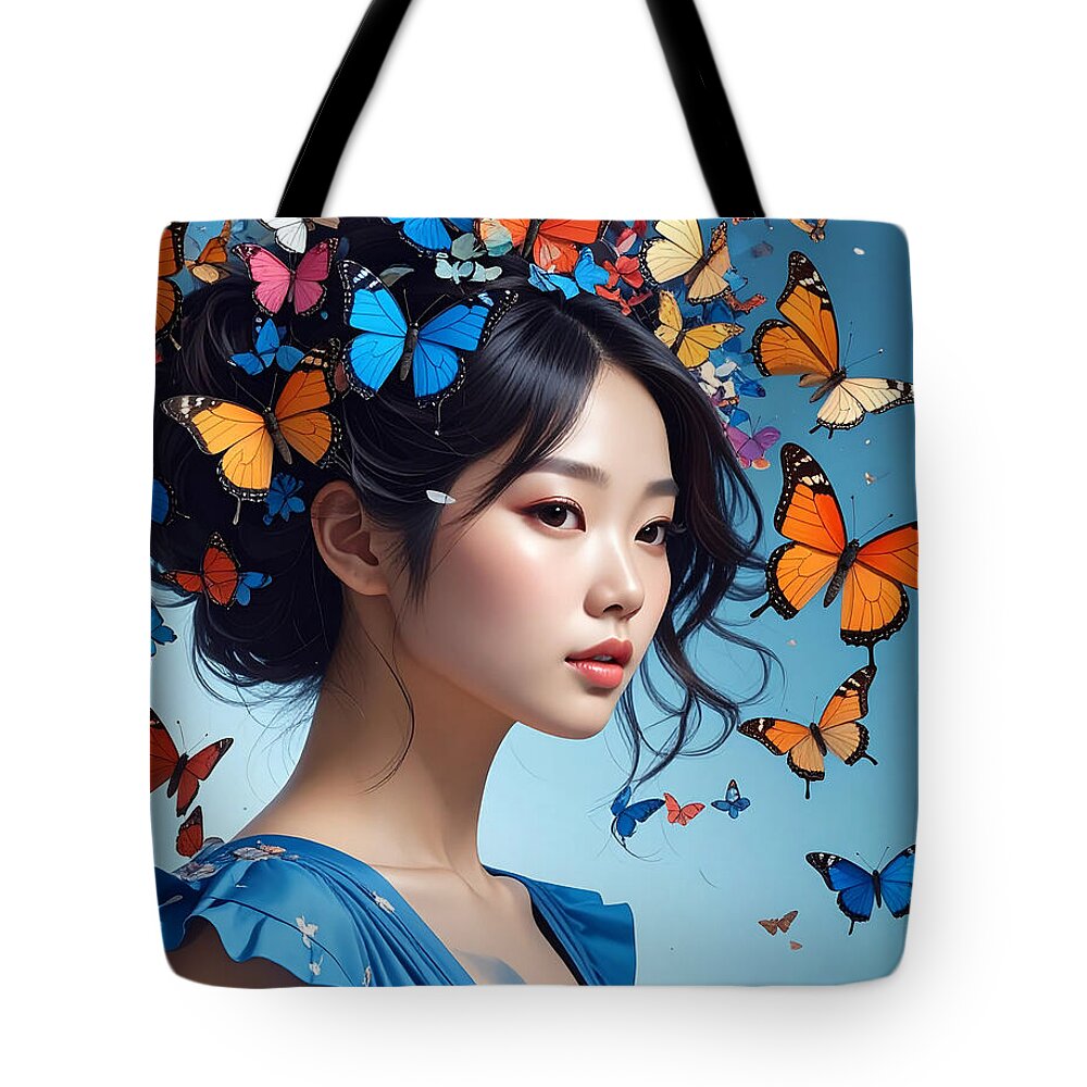 Purchase a tote bag featuring the ai art "Woman with Colorful Butterflies" by Cindy Boyd. Our tote bags are made from soft, durable, poly-poplin fabric and include a 1" black strap for easy carrying on your shoulder. All seams are double-stitched for added durability. Each tote bag is machine-washable in cold water and is printed on both sides using the same image.
